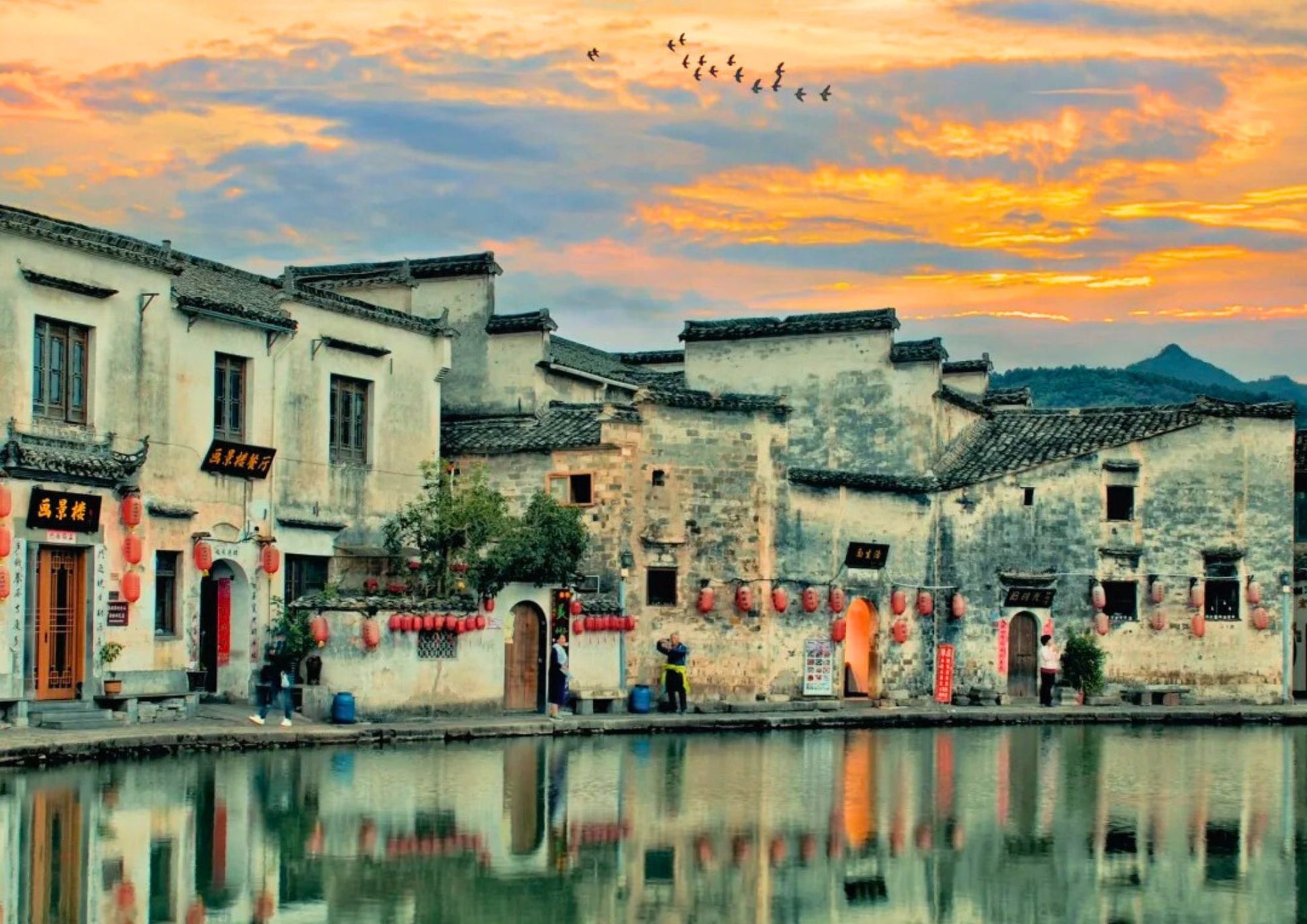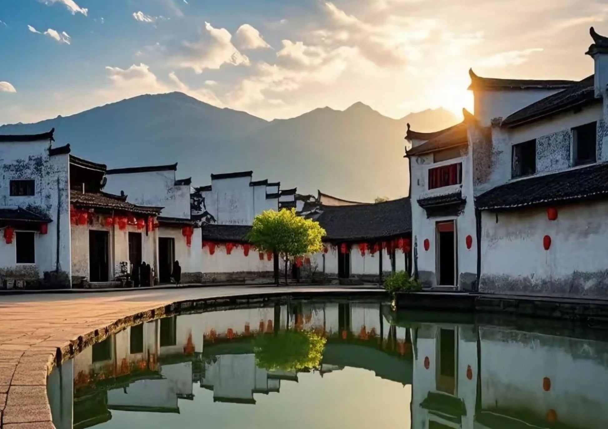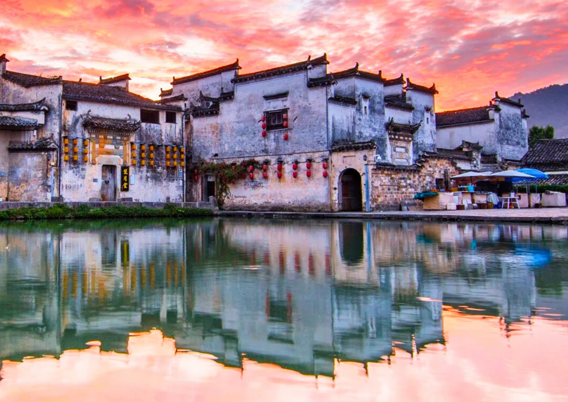 宏村は中国安徽省黟県にあり、「中国絵画の中の村」と称されています。巧妙な水系設計で知られ、月沼と南湖が白い壁と黒い瓦を映し出す風景は絵のようです。徽派建築の代表であり、世界遺産にも登録されています。
