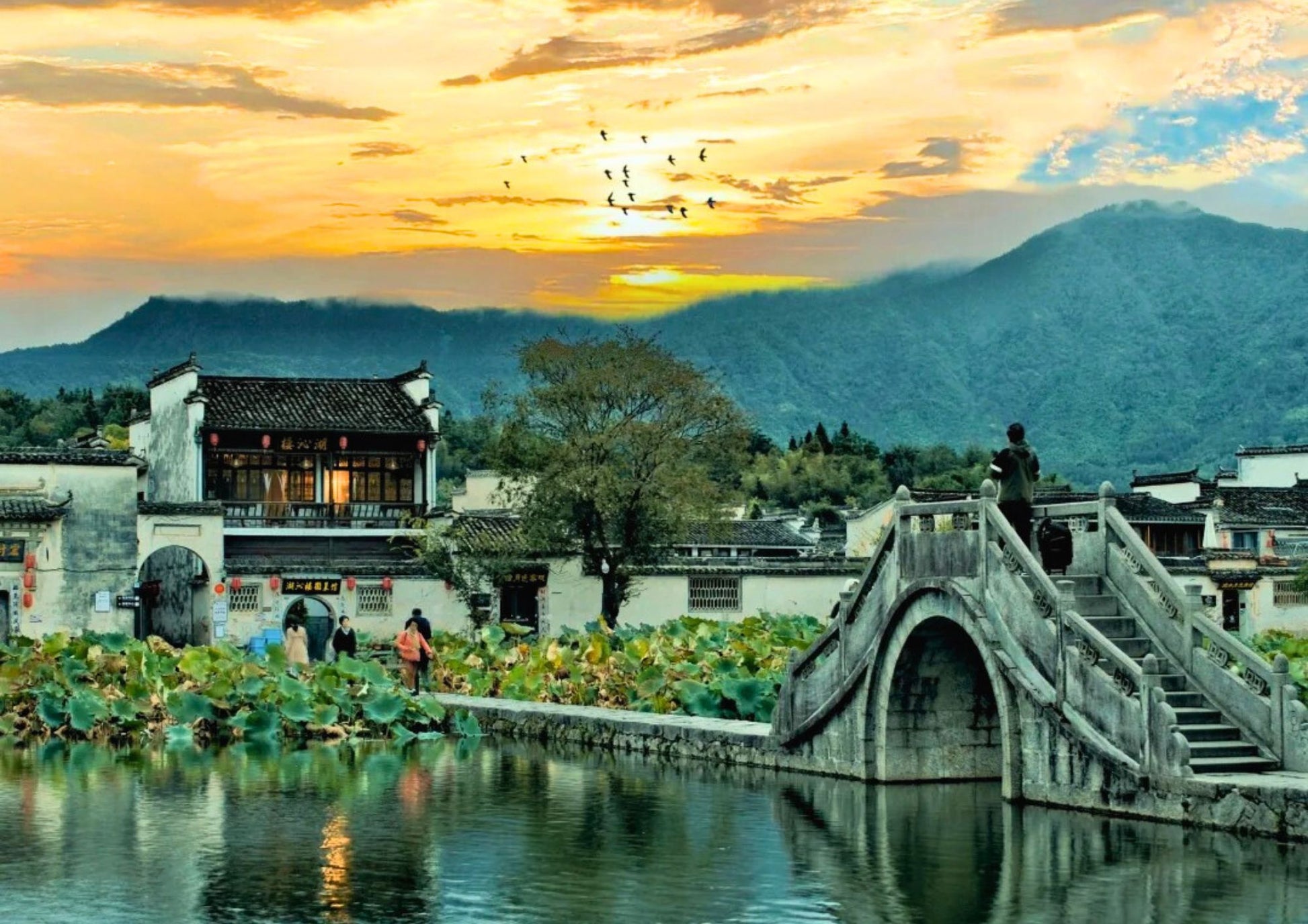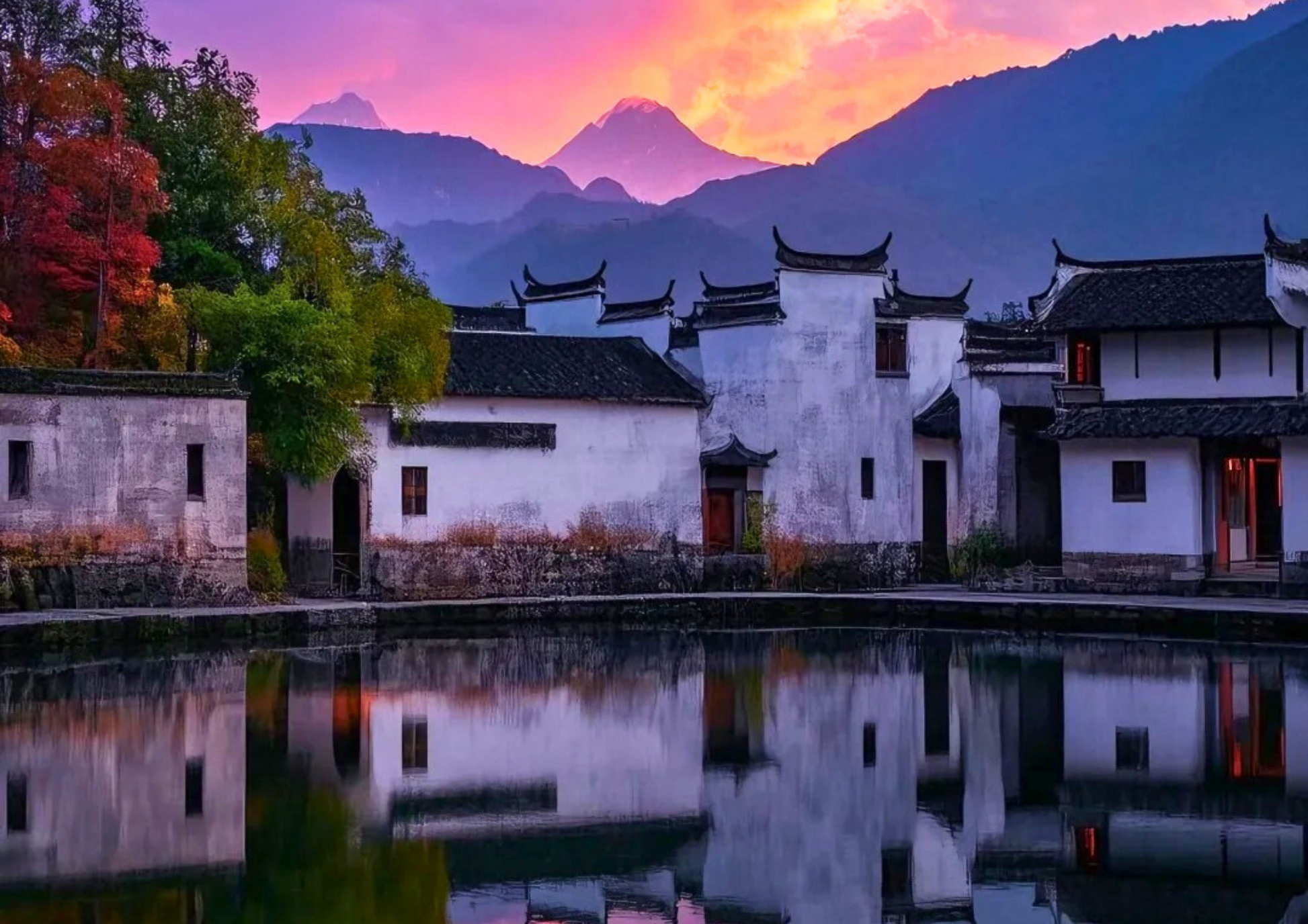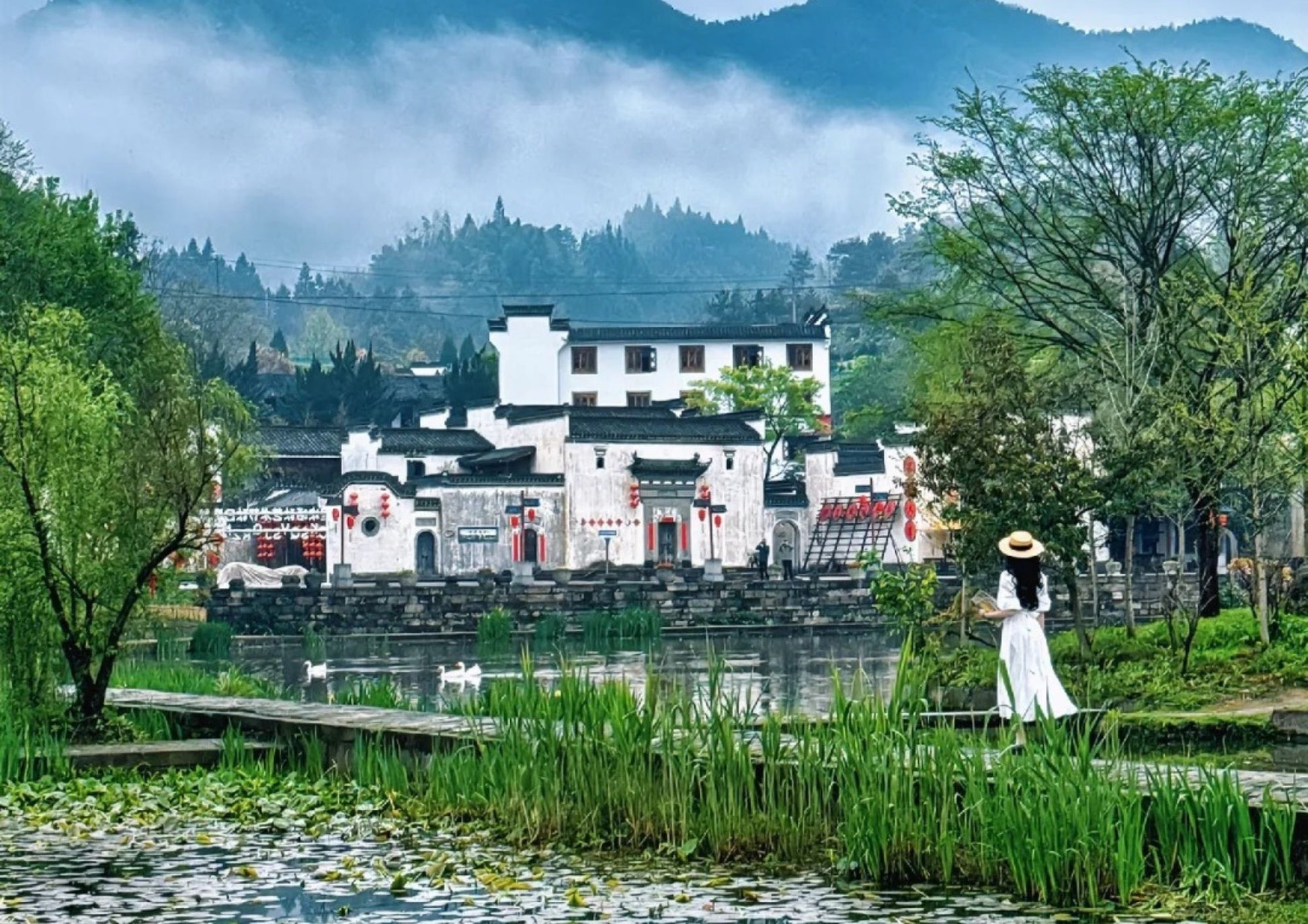 宏村は中国安徽省黟県にあり、「中国絵画の中の村」と称されています。巧妙な水系設計で知られ、月沼と南湖が白い壁と黒い瓦を映し出す風景は絵のようです。徽派建築の代表であり、世界遺産にも登録されています。