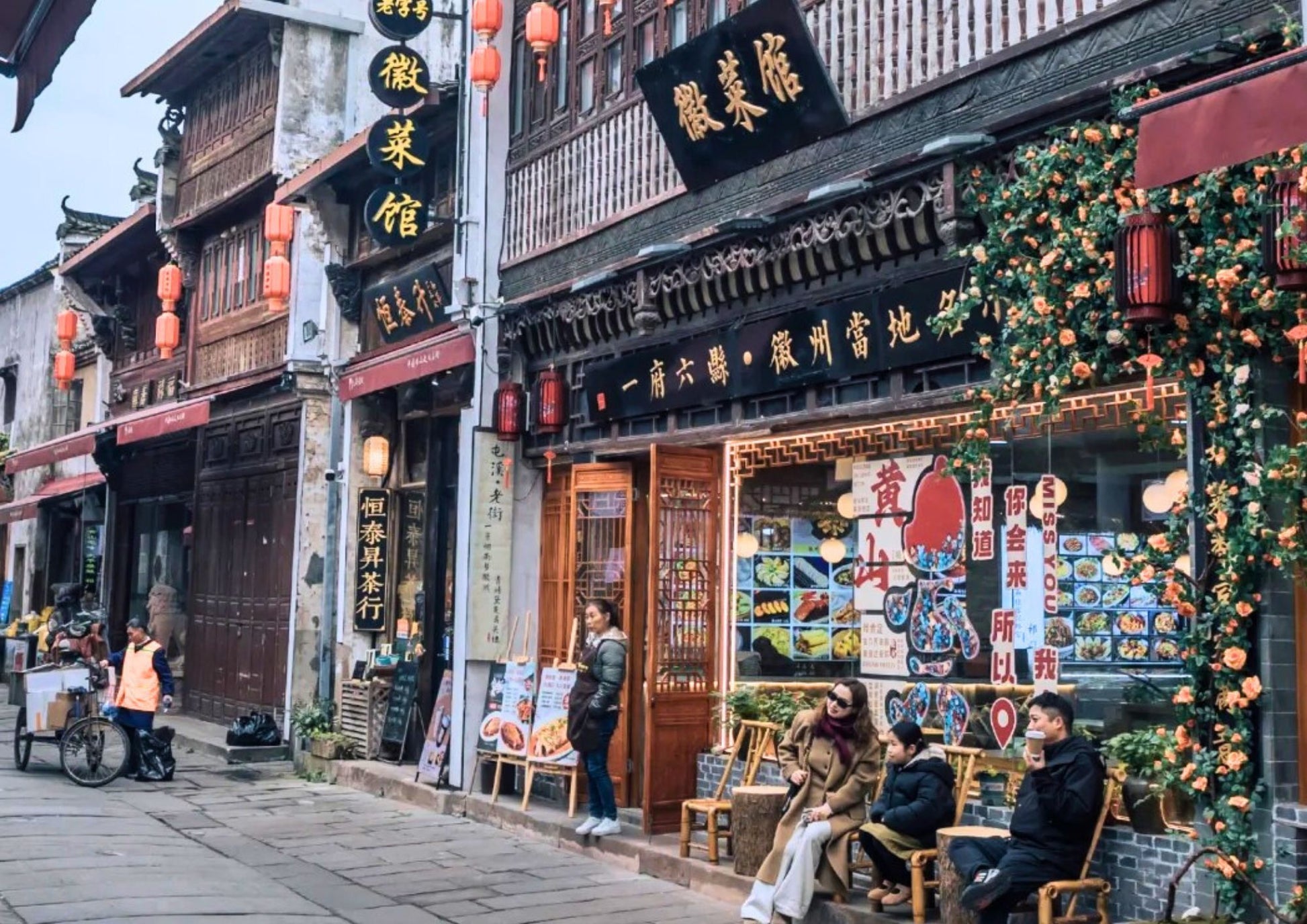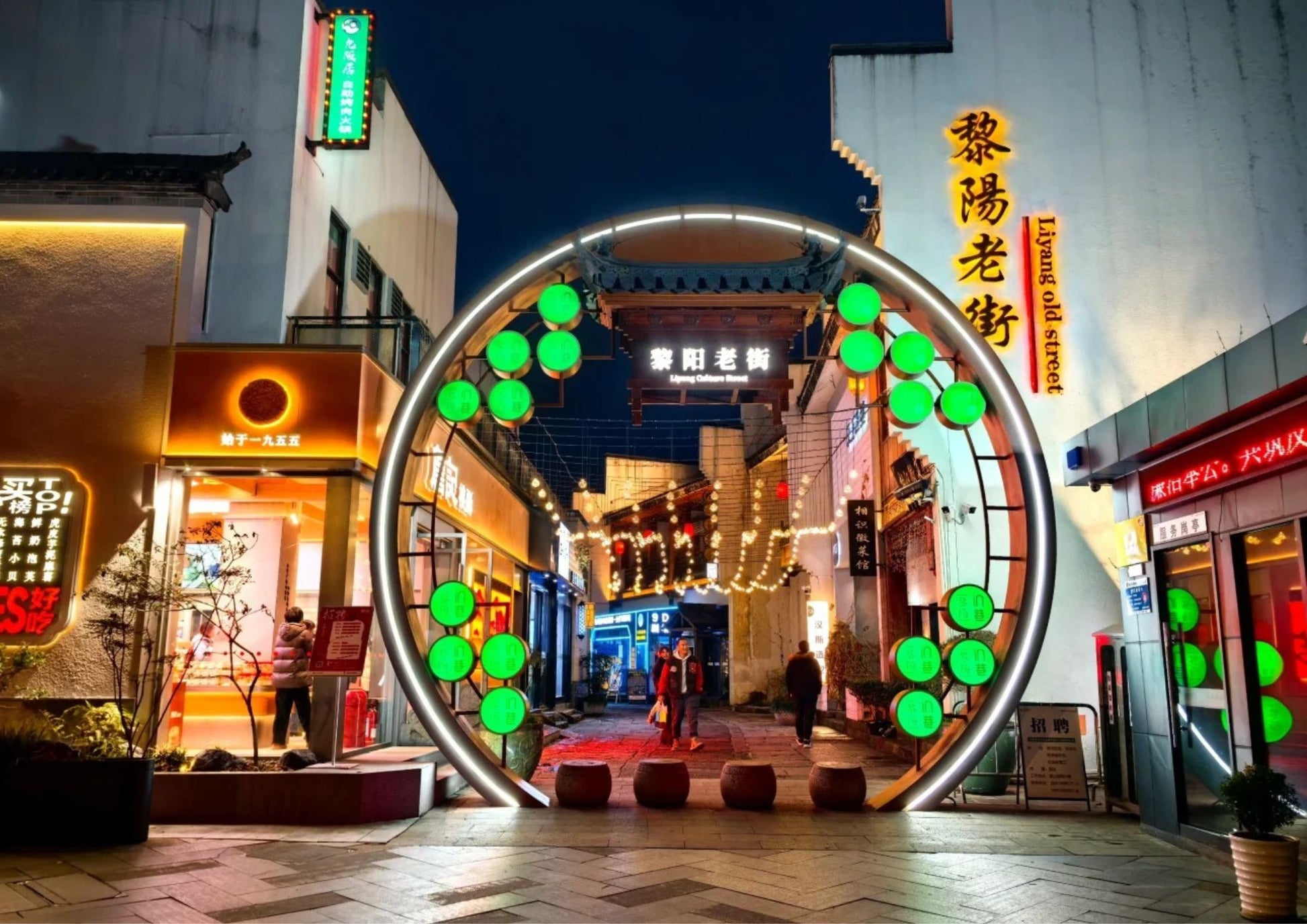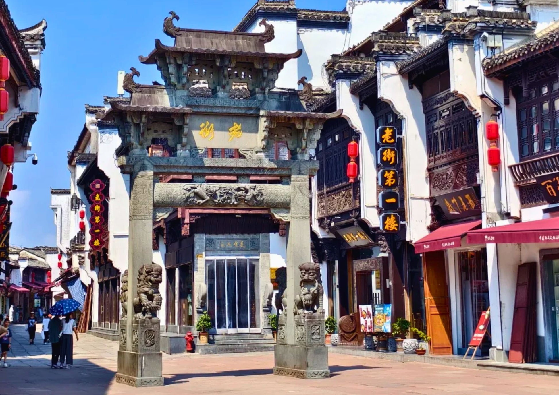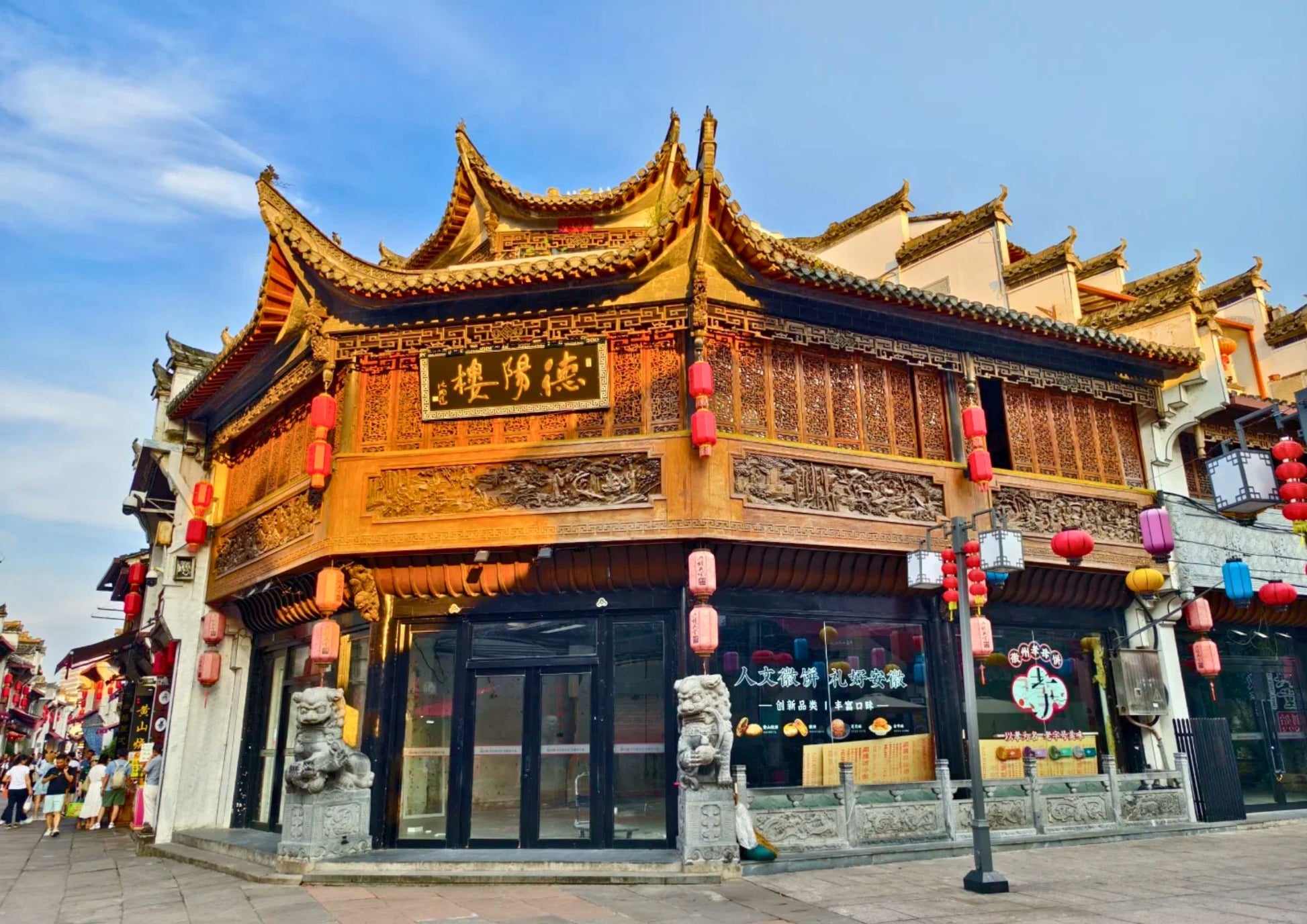 黎陽老街は、屯溪老街と川を挟んで向かい合う、黄山市の新旧融合を象徴するスポットです。文芸ショップ、おしゃれなカフェと伝統的な徽派建築が共存し、夜はライトアップで幻想的。散策や写真撮影に最適です。