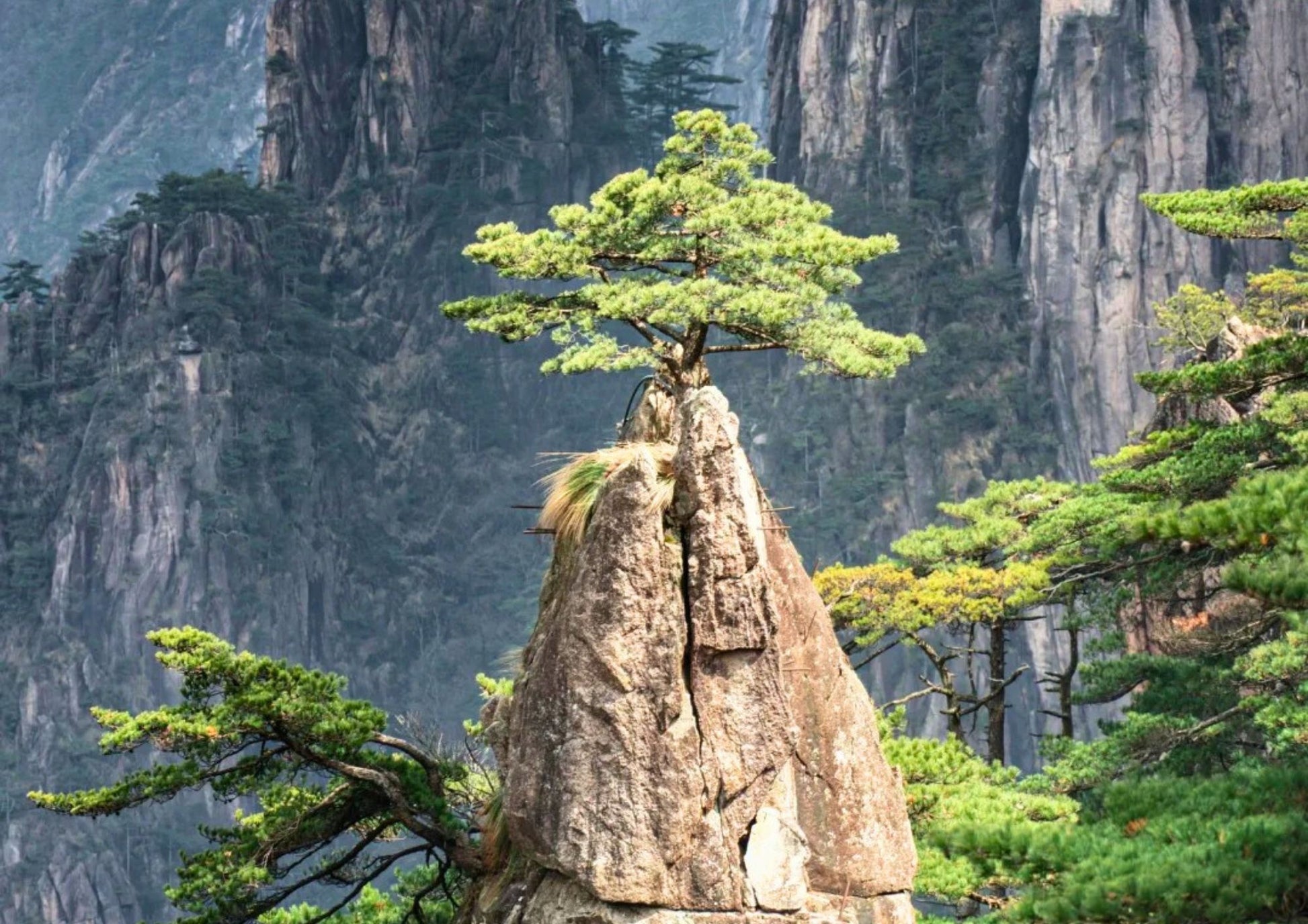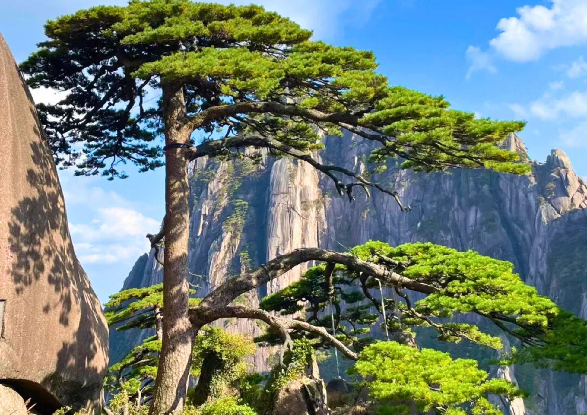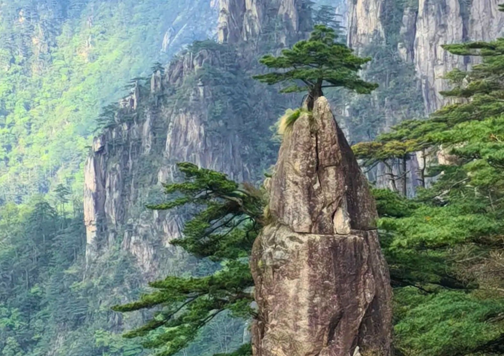迎客松は黄山のシンボルで、玉屏楼のそばに千年以上の樹齢でそびえています。枝は広がった腕のように見え、訪れる人々を温かく迎える姿が、黄山の松の生命力と美しさを象徴しています。