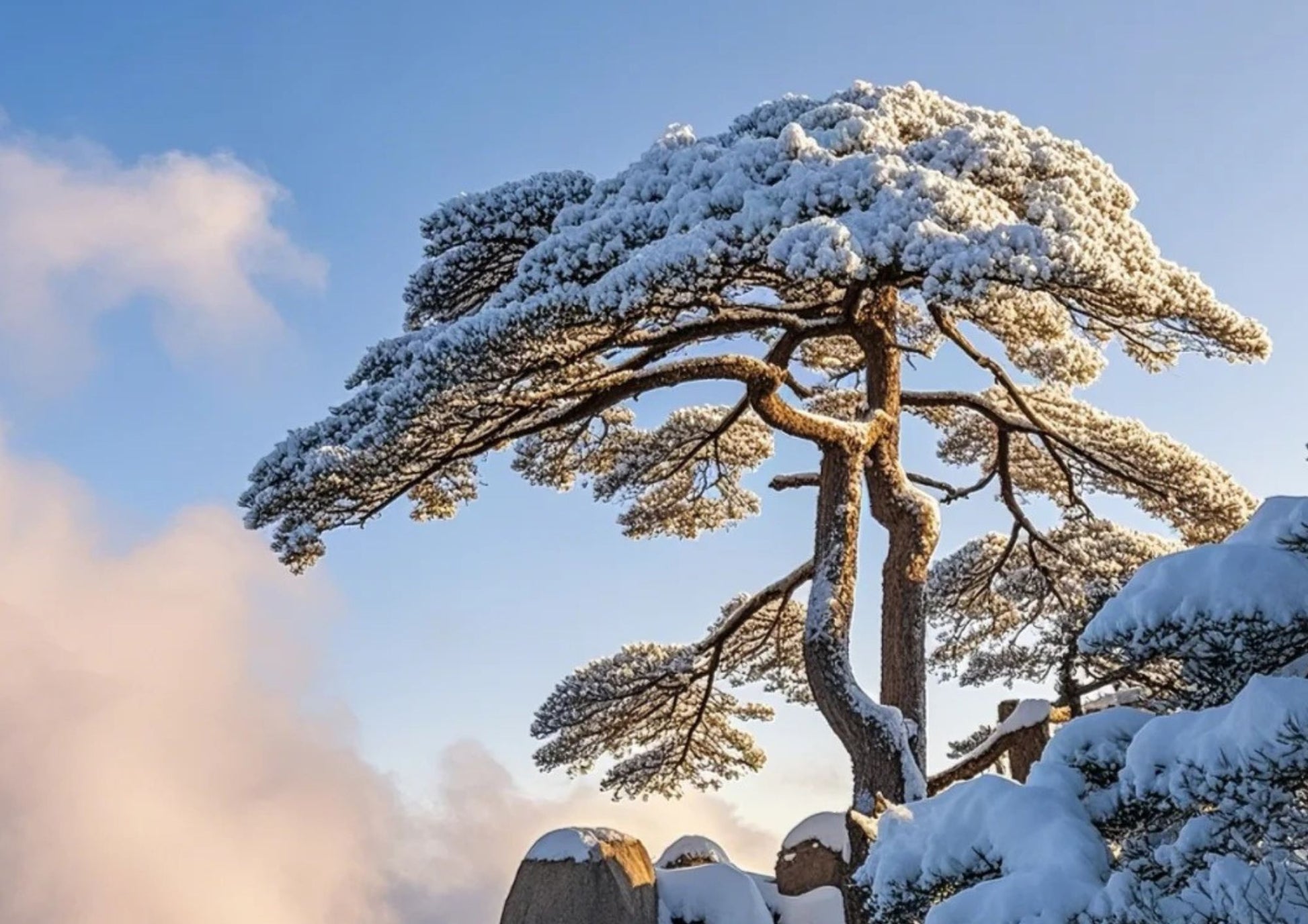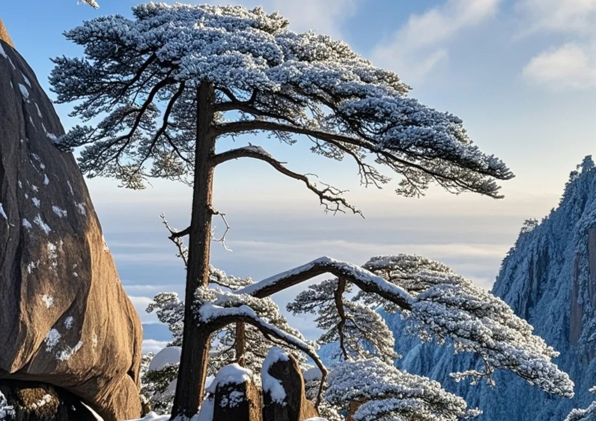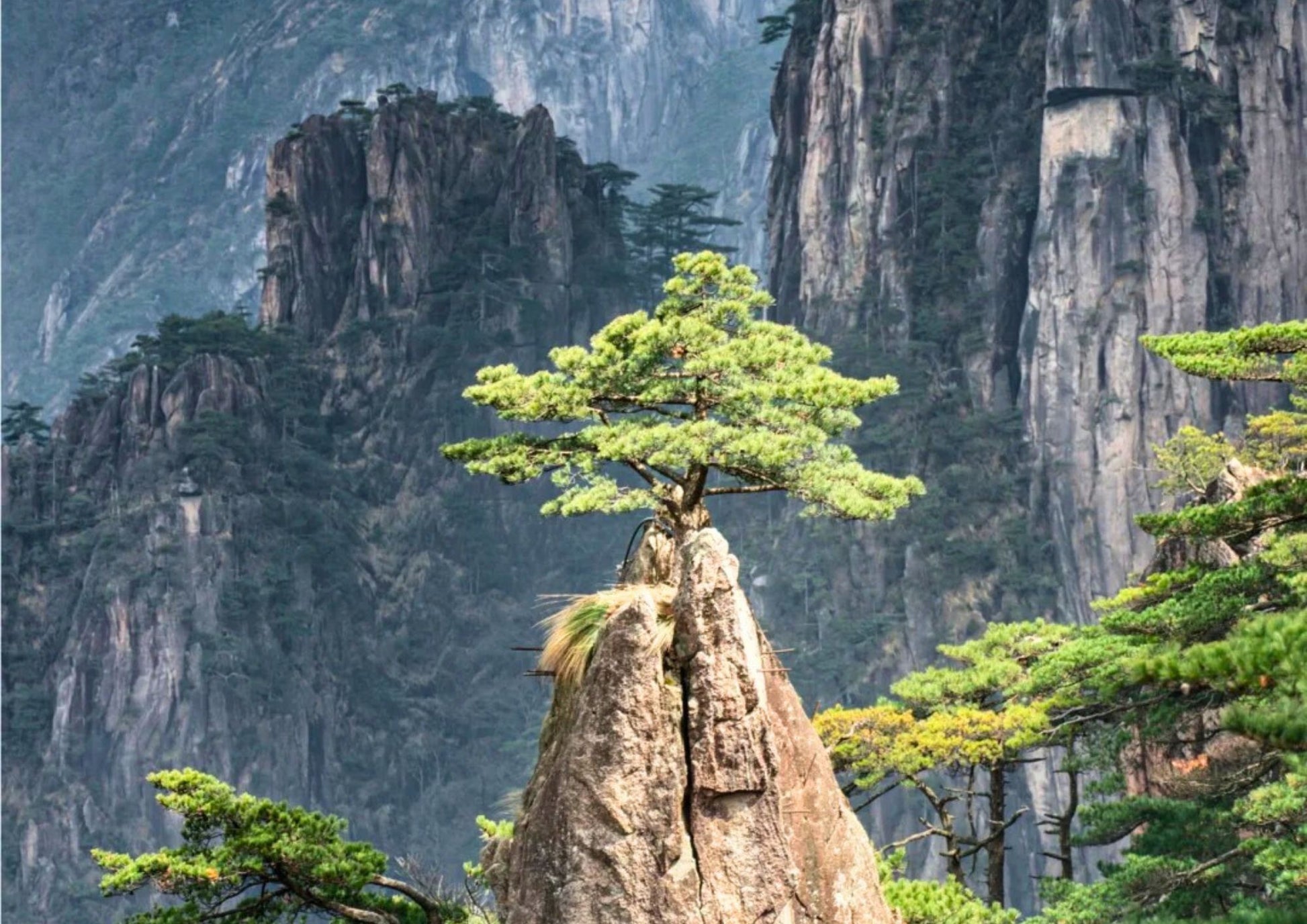 迎客松は黄山のシンボルで、玉屏楼のそばに千年以上の樹齢でそびえています。枝は広がった腕のように見え、訪れる人々を温かく迎える姿が、黄山の松の生命力と美しさを象徴しています。