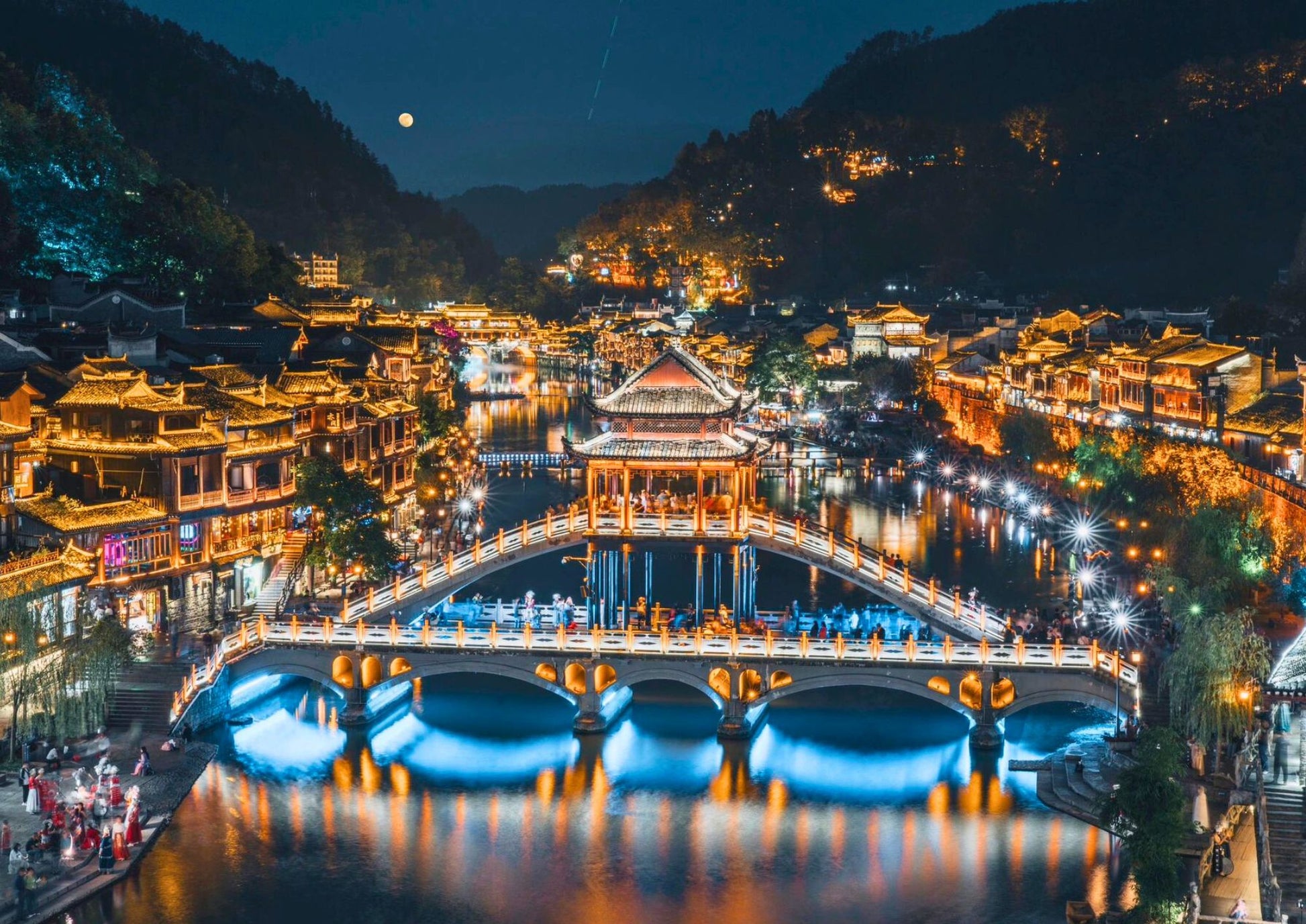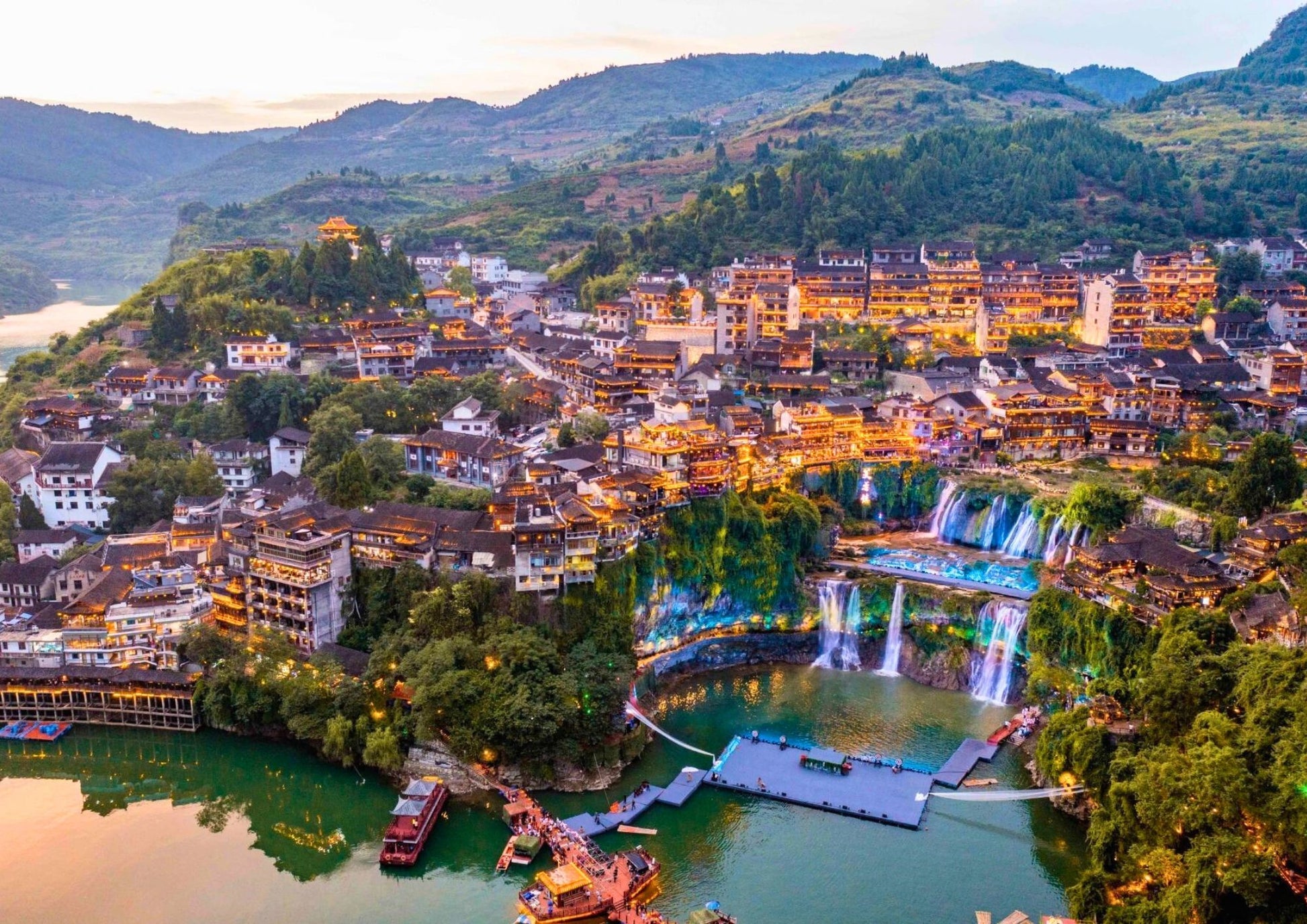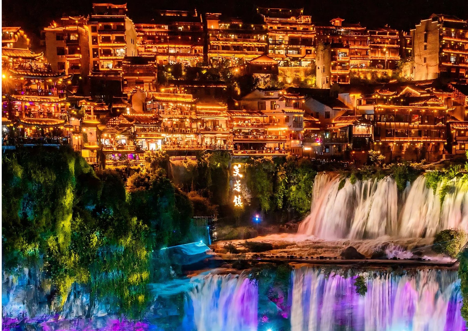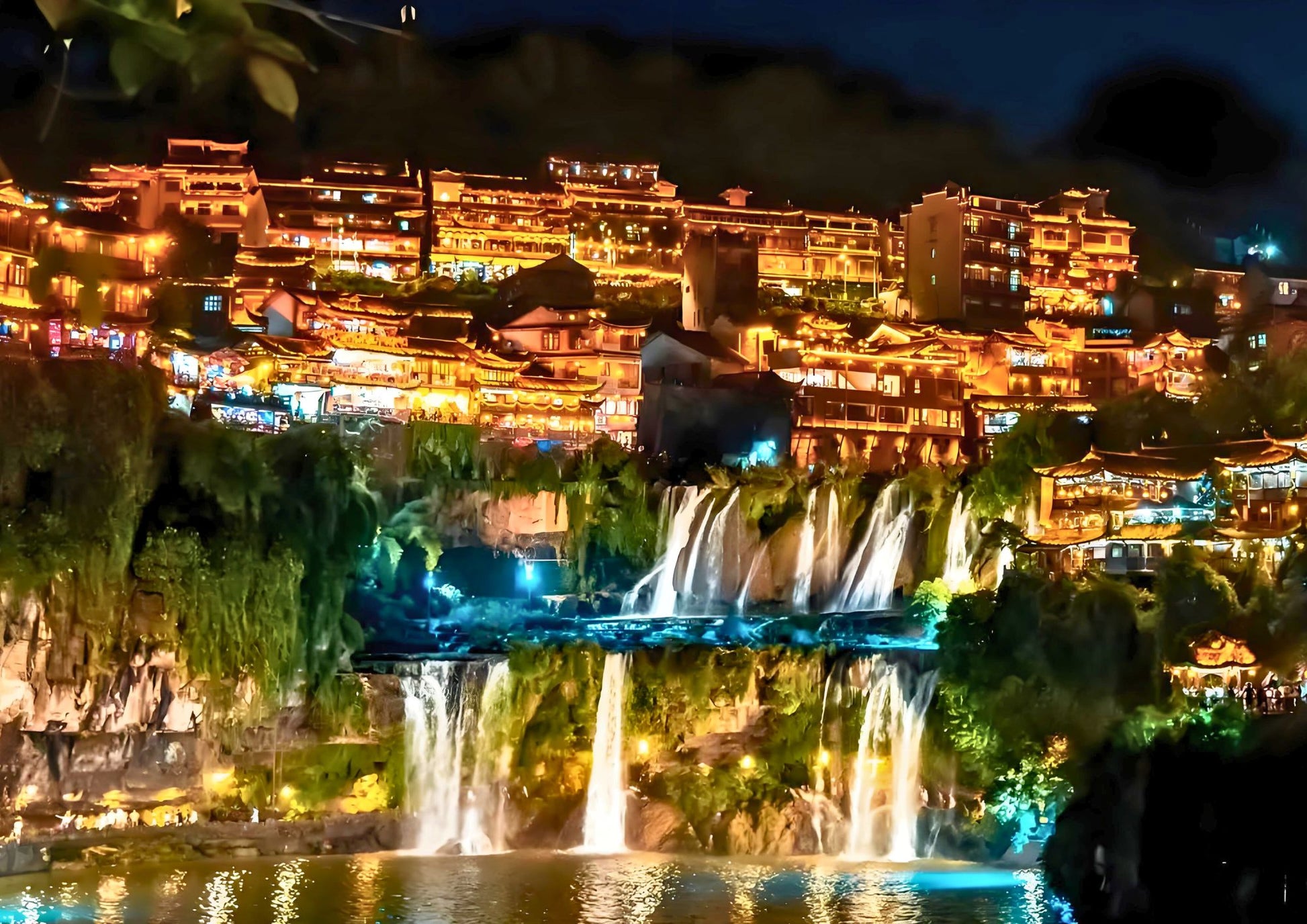 芙蓉鎮は湘西の千年古都。川沿いに建つ高床式家屋と町を流れる滝が特徴で、夜には提灯に照らされた路地が映画『芙蓉鎮』の世界を再現します。