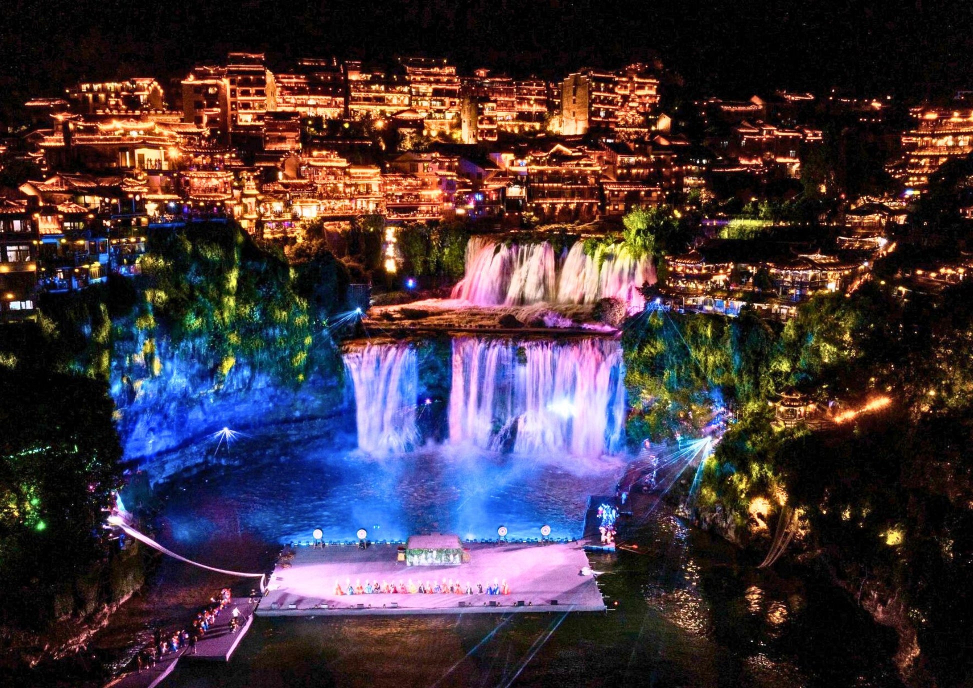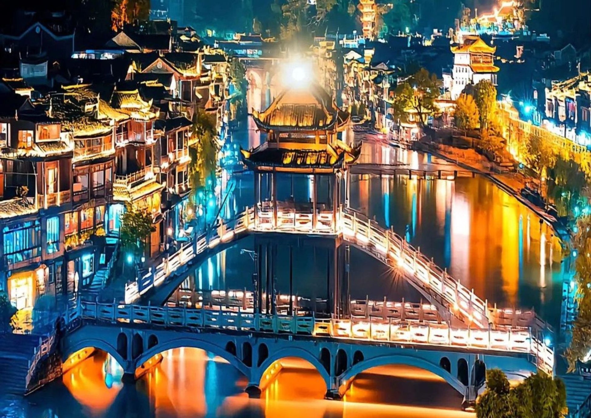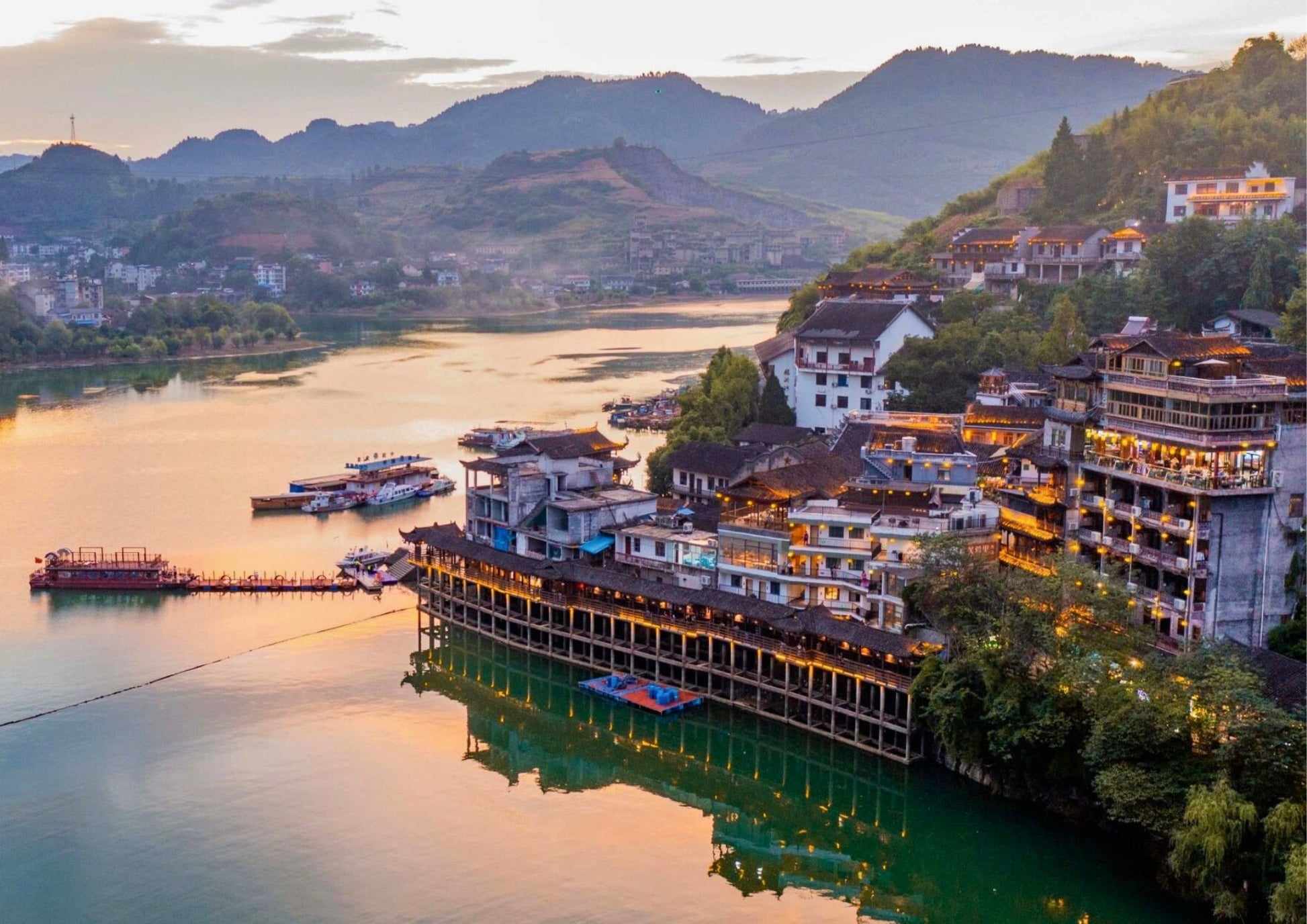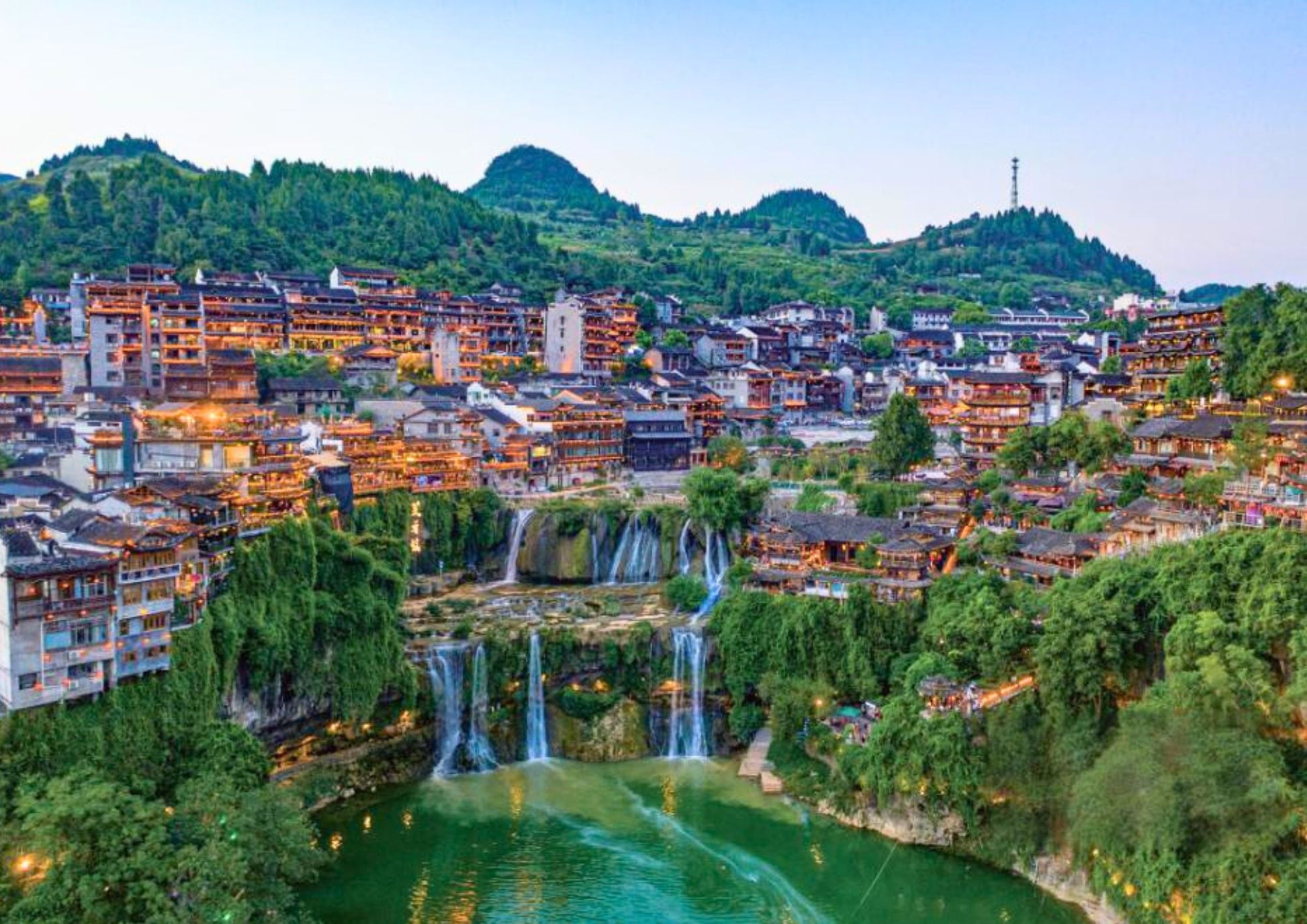 芙蓉鎮は湘西の千年古都。川沿いに建つ高床式家屋と町を流れる滝が特徴で、夜には提灯に照らされた路地が映画『芙蓉鎮』の世界を再現します。