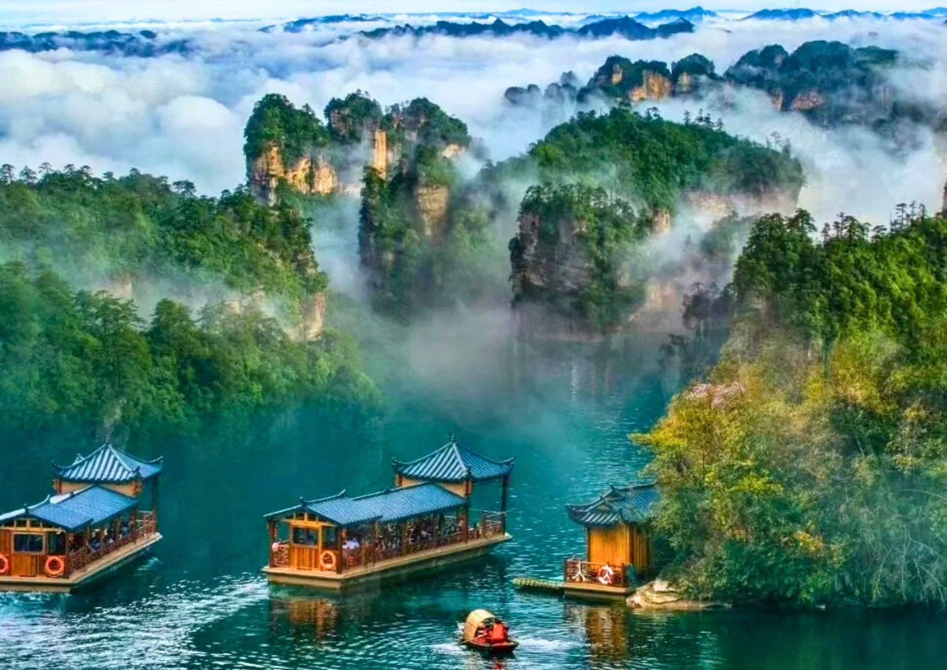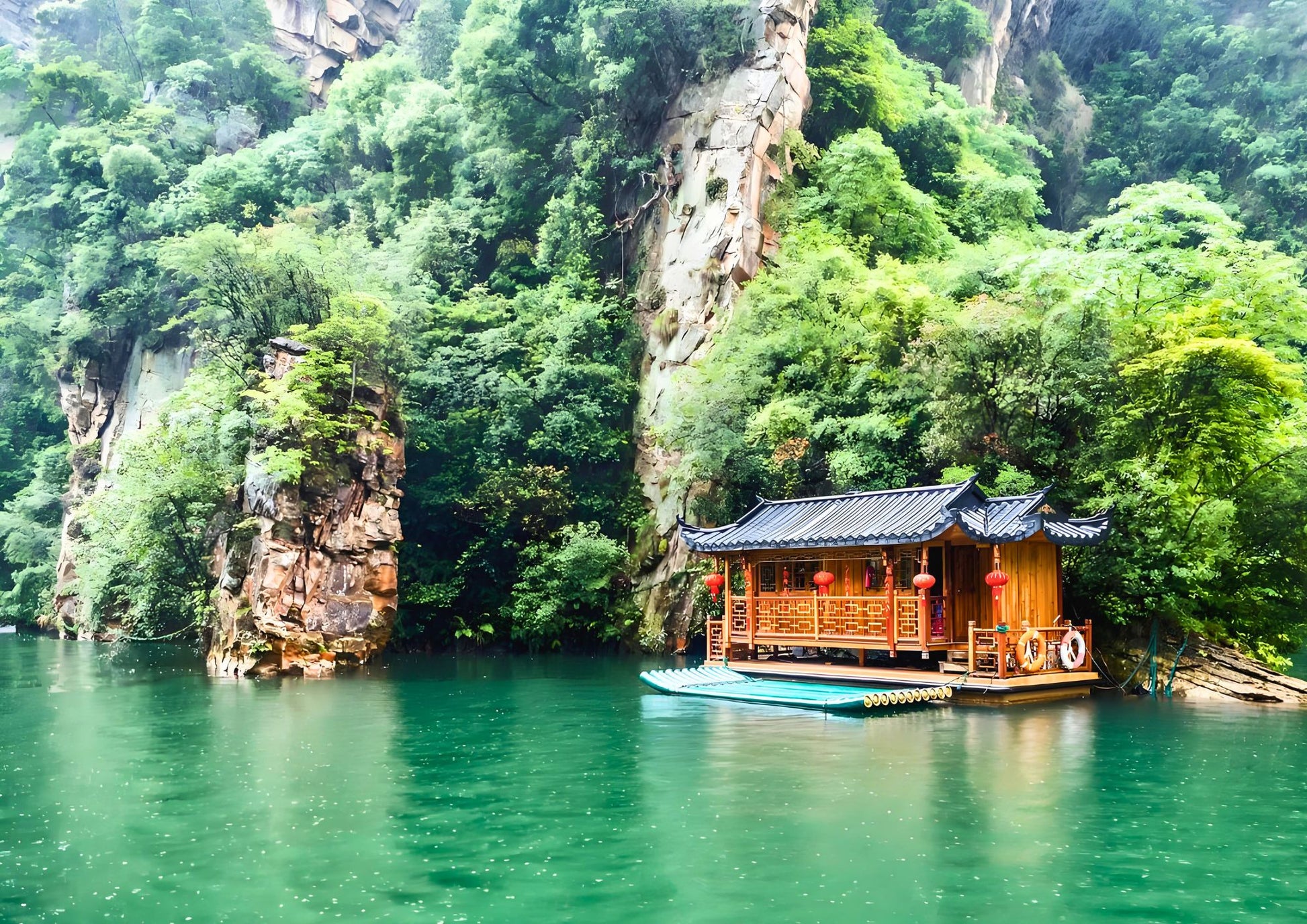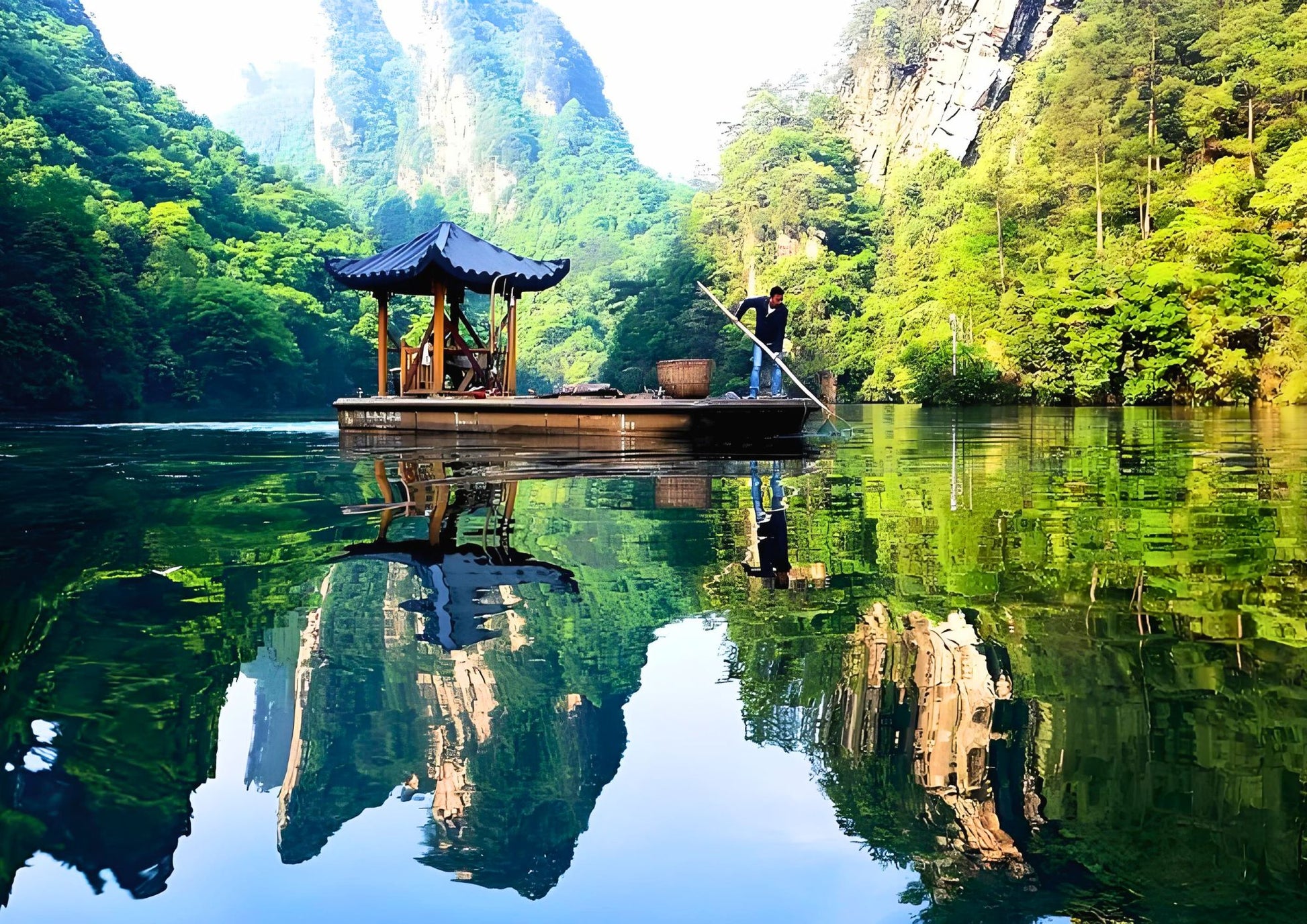 張家界・武陵源の宝峰湖は、緑の湖水と奇岩に囲まれた「地上の仙境」。ボートに乗れば、山と湖が織りなす幻想的な景色が広がります。