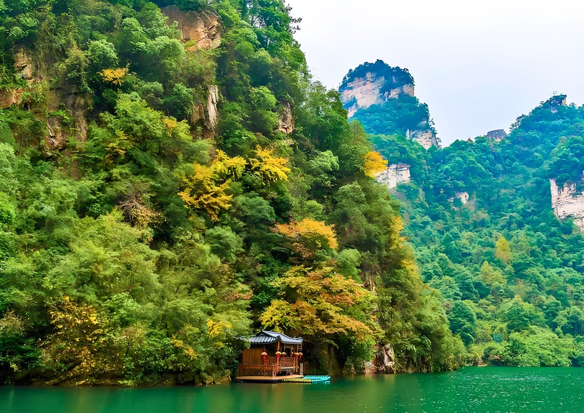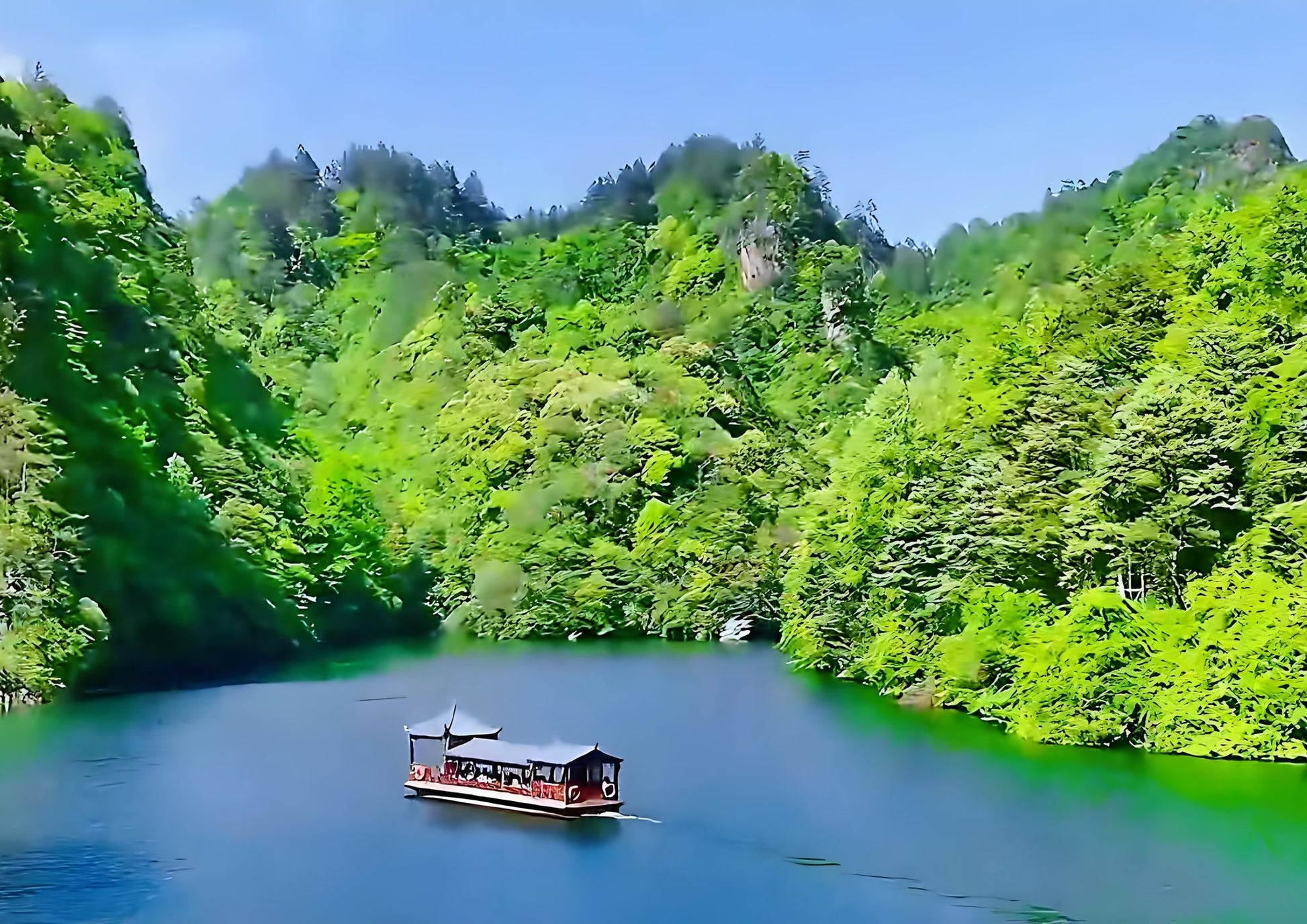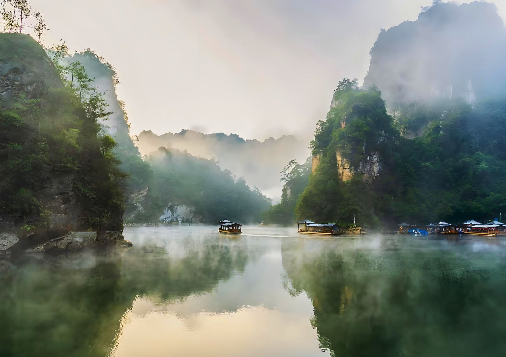 張家界・武陵源の宝峰湖は、緑の湖水と奇岩に囲まれた「地上の仙境」。ボートに乗れば、山と湖が織りなす幻想的な景色が広がります。