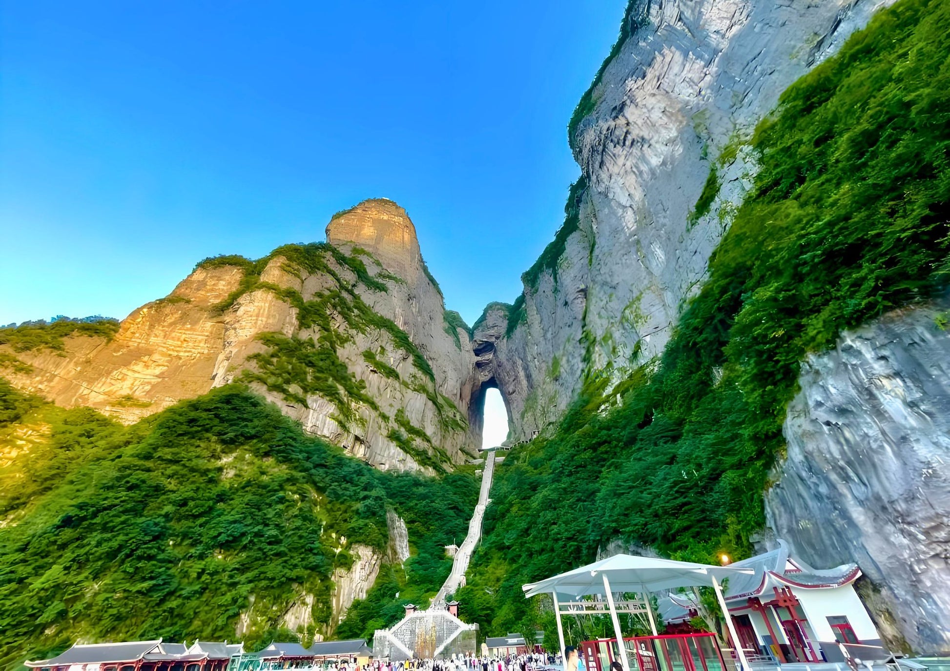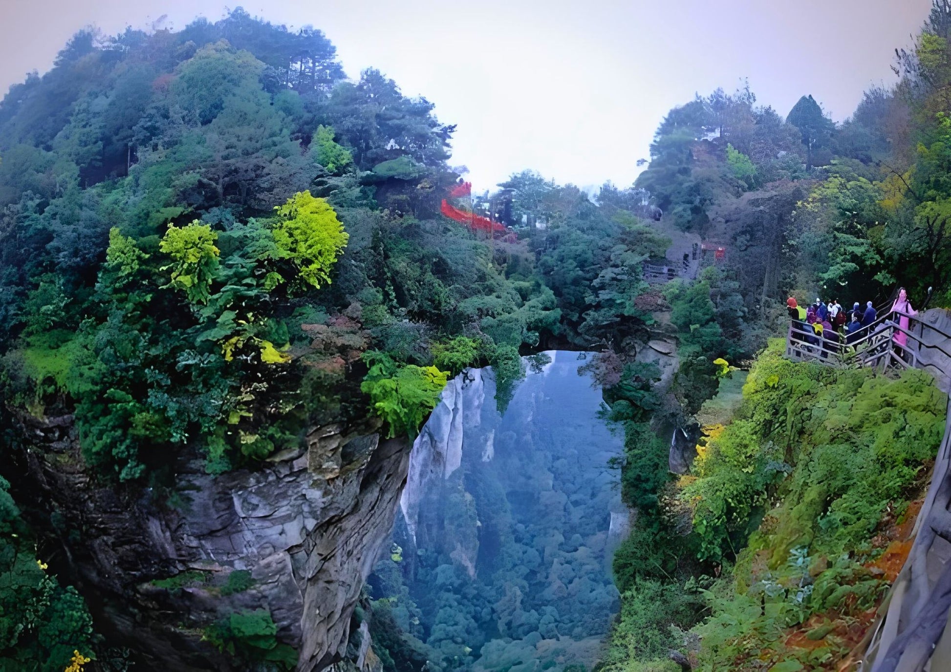 張家界国家森林公園の「天下第一橋」は、二つの岩峰が自然に繋がった奇跡の景観。高さ350メートルから深い谷を望む絶景は、大自然の神秘を感じさせます。