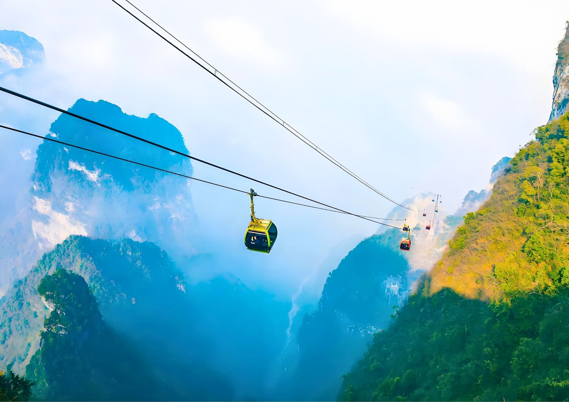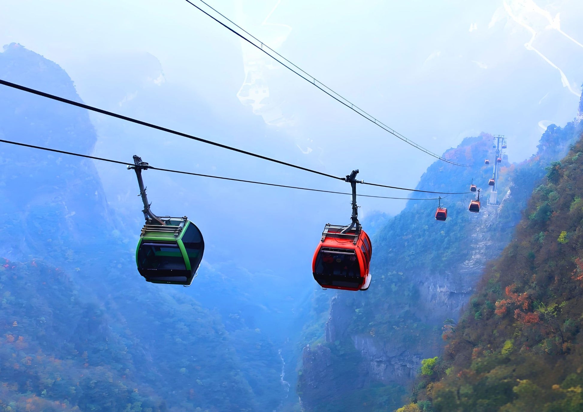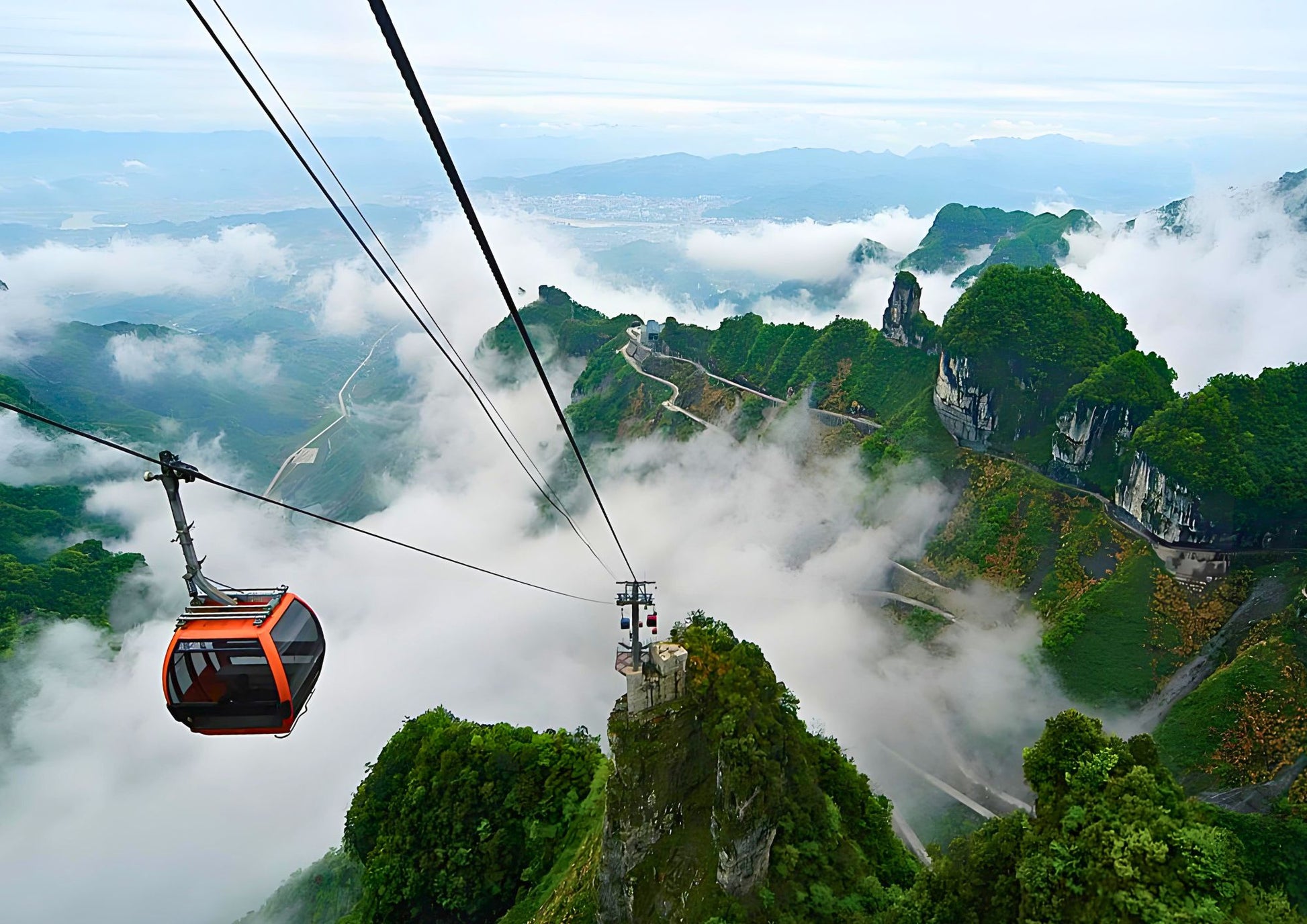 天門山ロープウェイは全長7.5キロで、世界最長の単線循環式です。街から山頂まで一気に登り、峡谷や雲海の絶景を楽しめます。スリル満点の体験です!