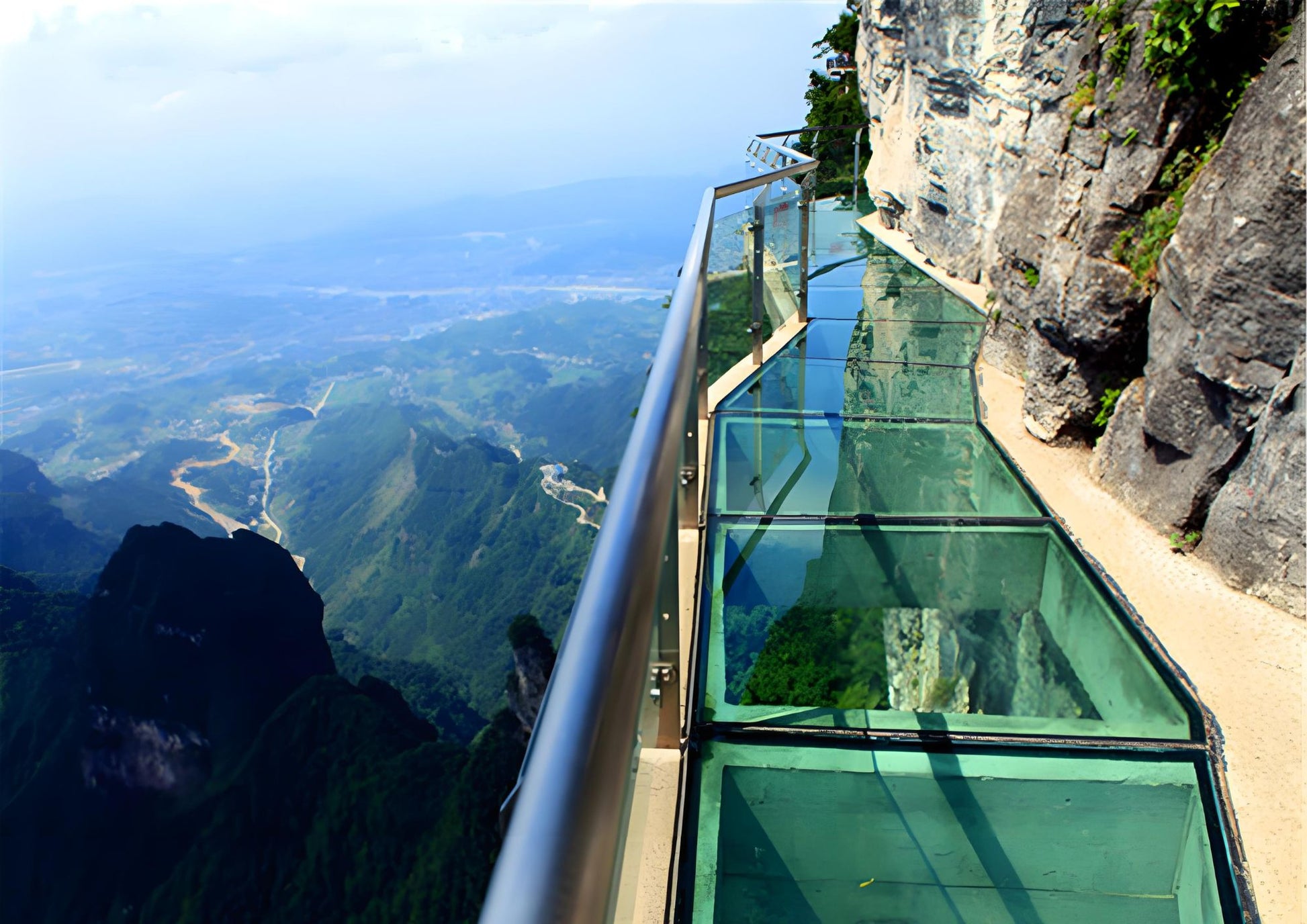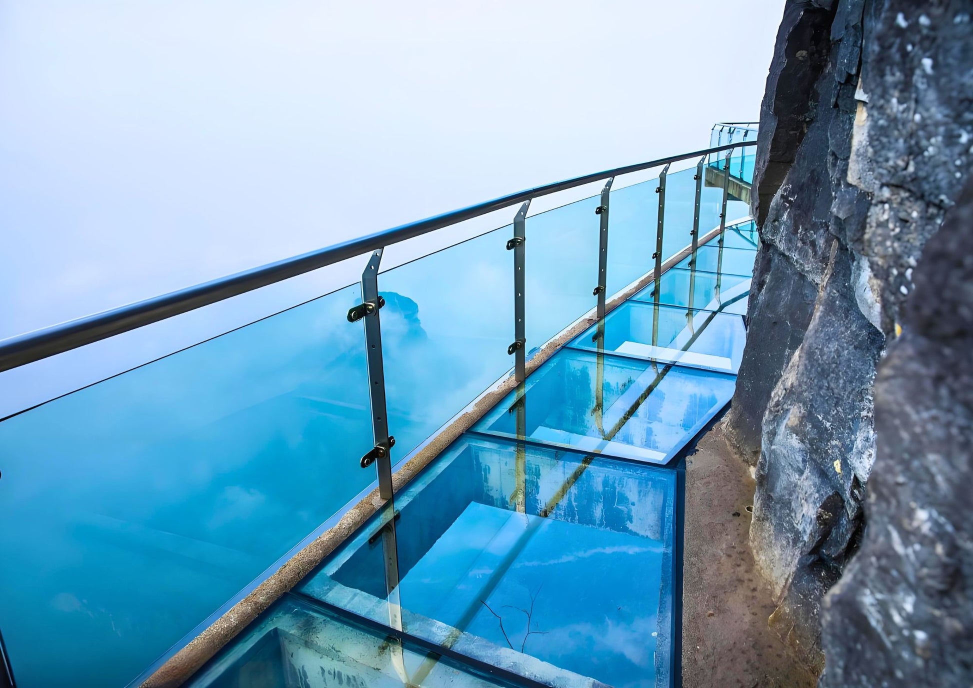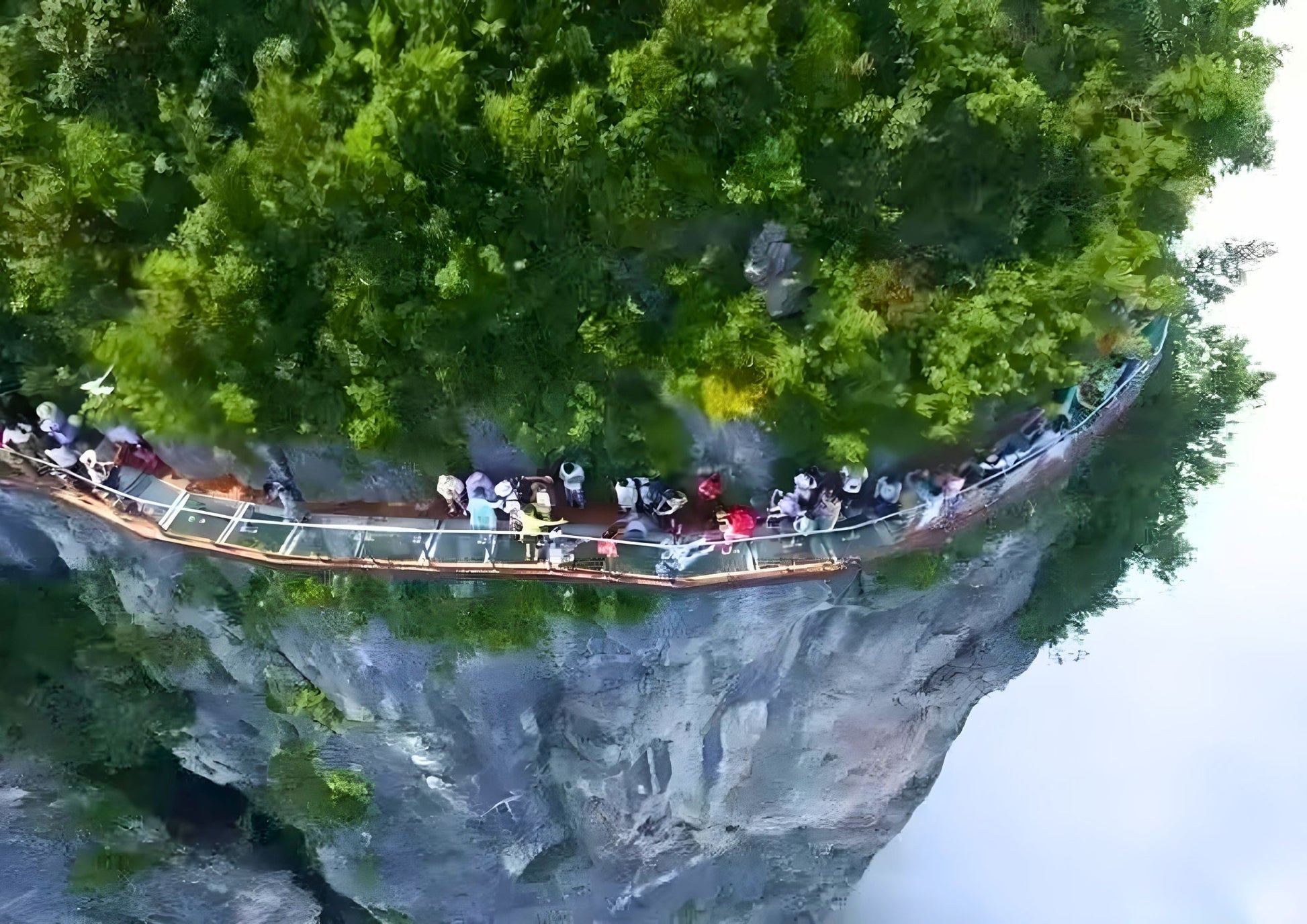 張家界・天門山のグラススカイウォークを歩けば、足元には深い谷底、目の前には霧に包まれた奇岩が広がり、スリル満点の景色と大自然の驚異を体感できます。