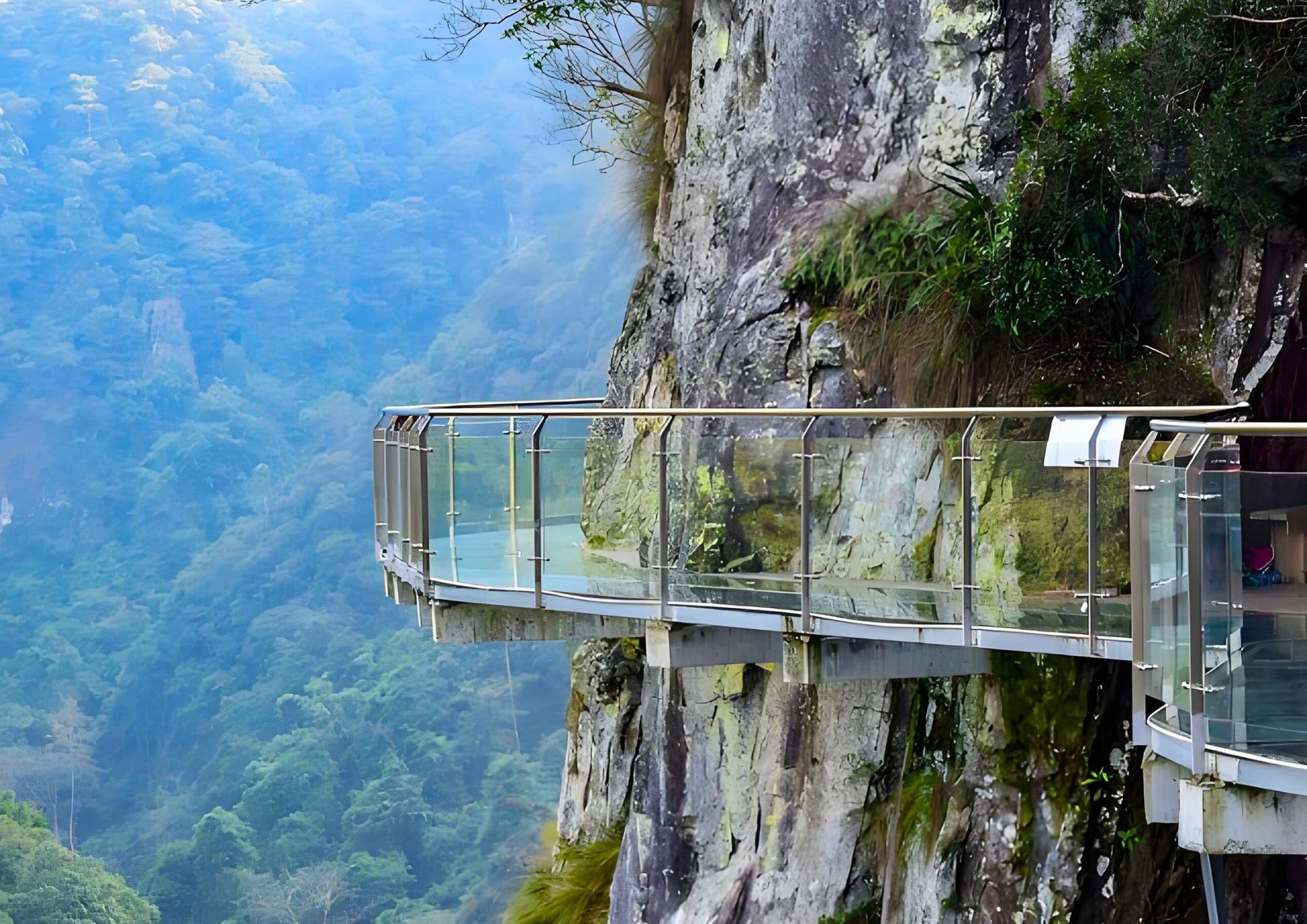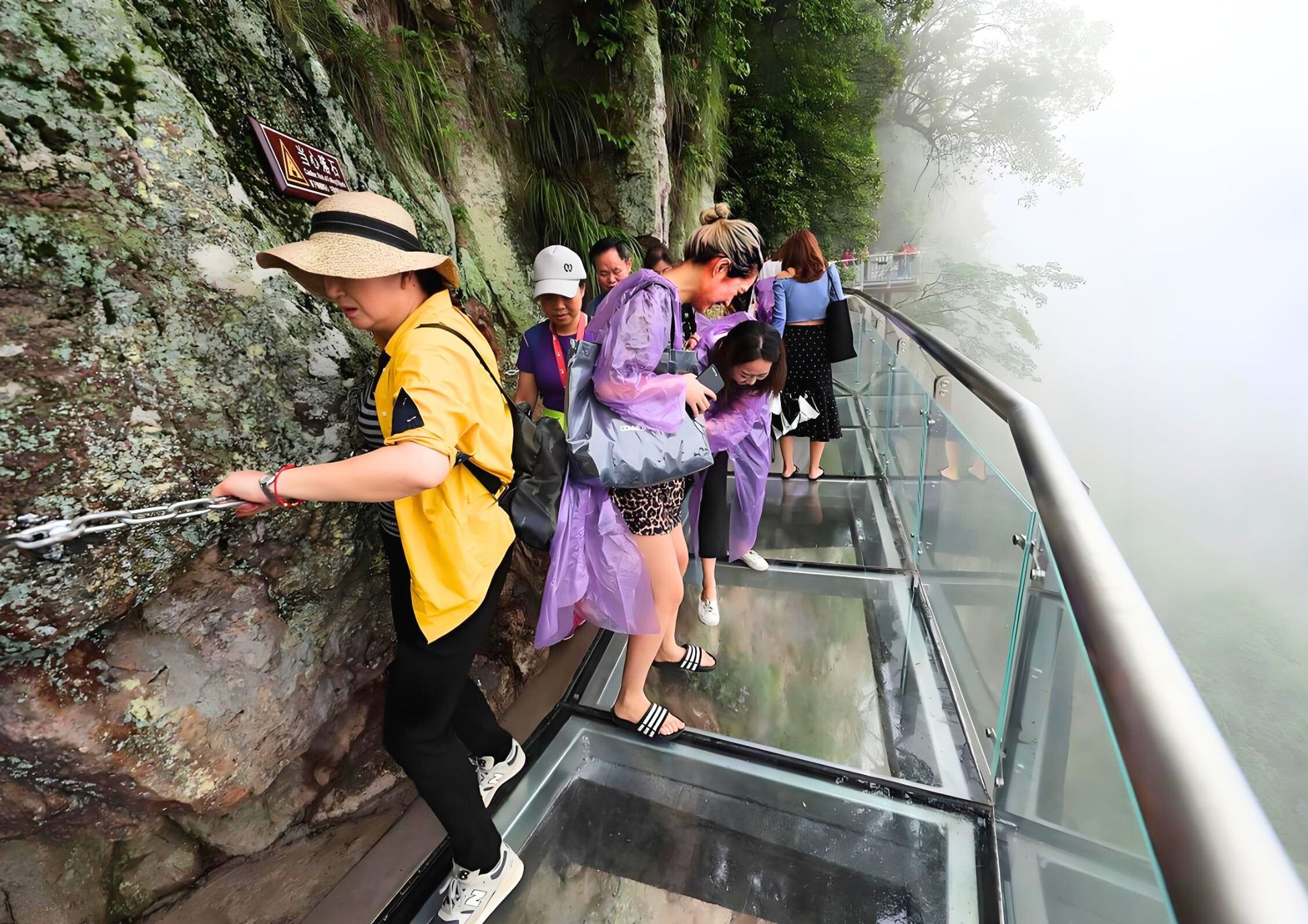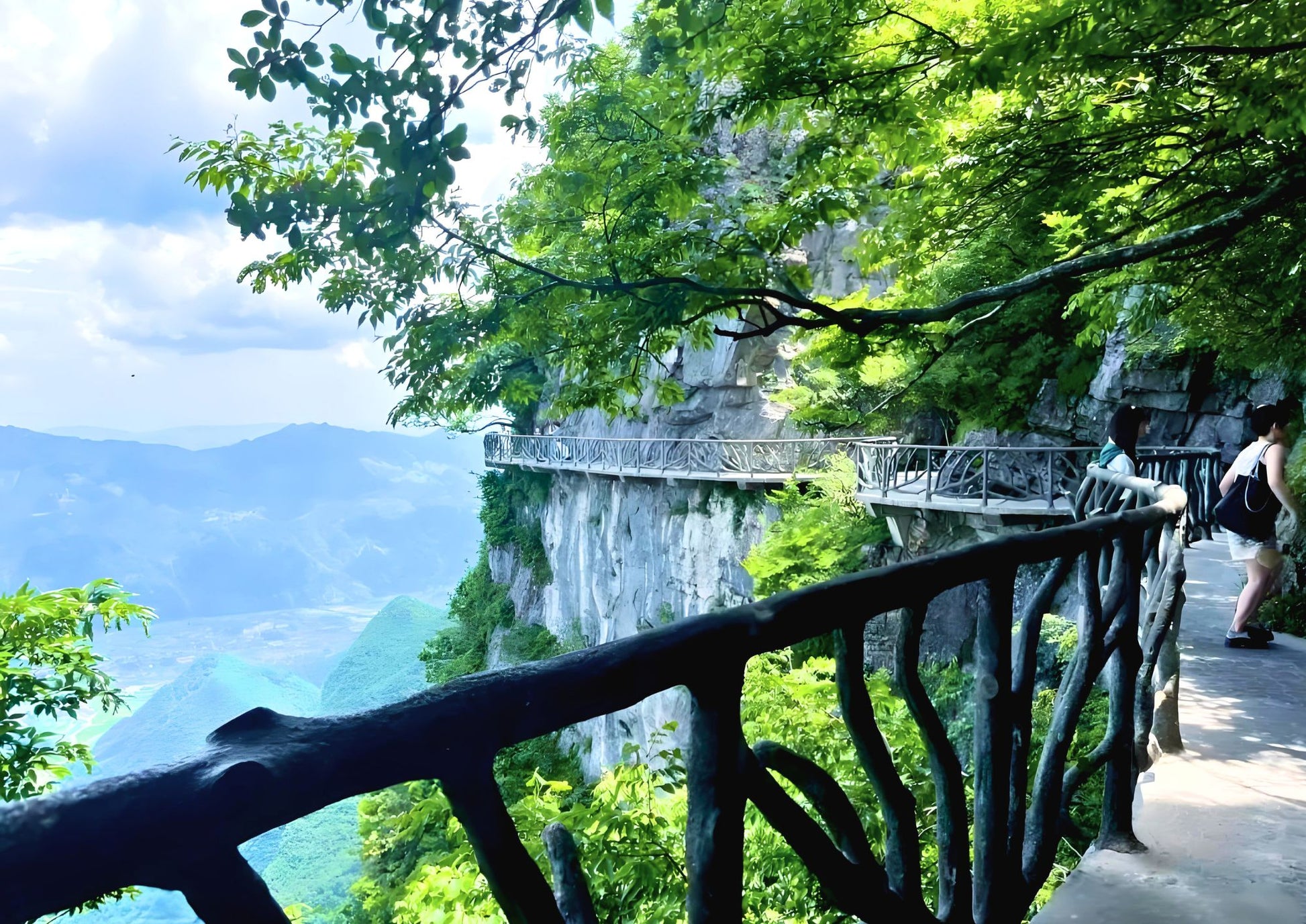 張家界・天門山のグラススカイウォークを歩けば、足元には深い谷底、目の前には霧に包まれた奇岩が広がり、スリル満点の景色と大自然の驚異を体感できます。