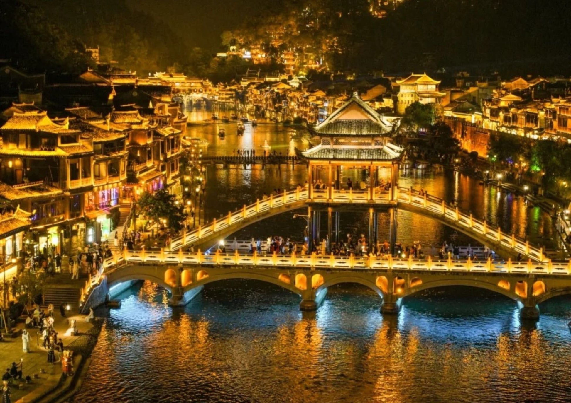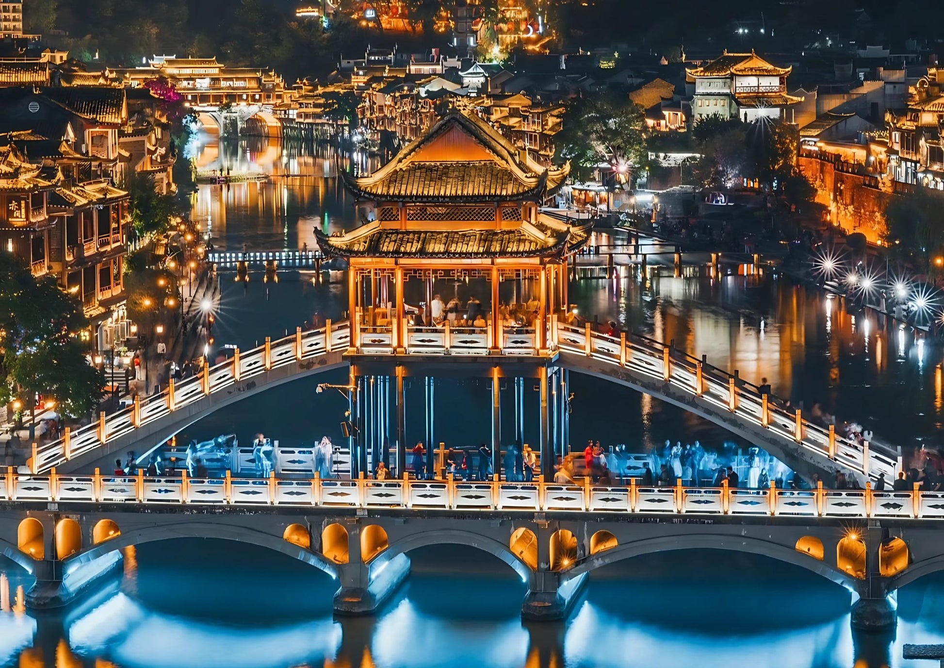 鳳凰古城の沱江に架かる虹橋風雨楼は明代築の屋根付き橋。精巧な木彫りと両側の店が並び、雨や日差しを避けながら、川岸の風景と町の活気を楽しめるスポットです。