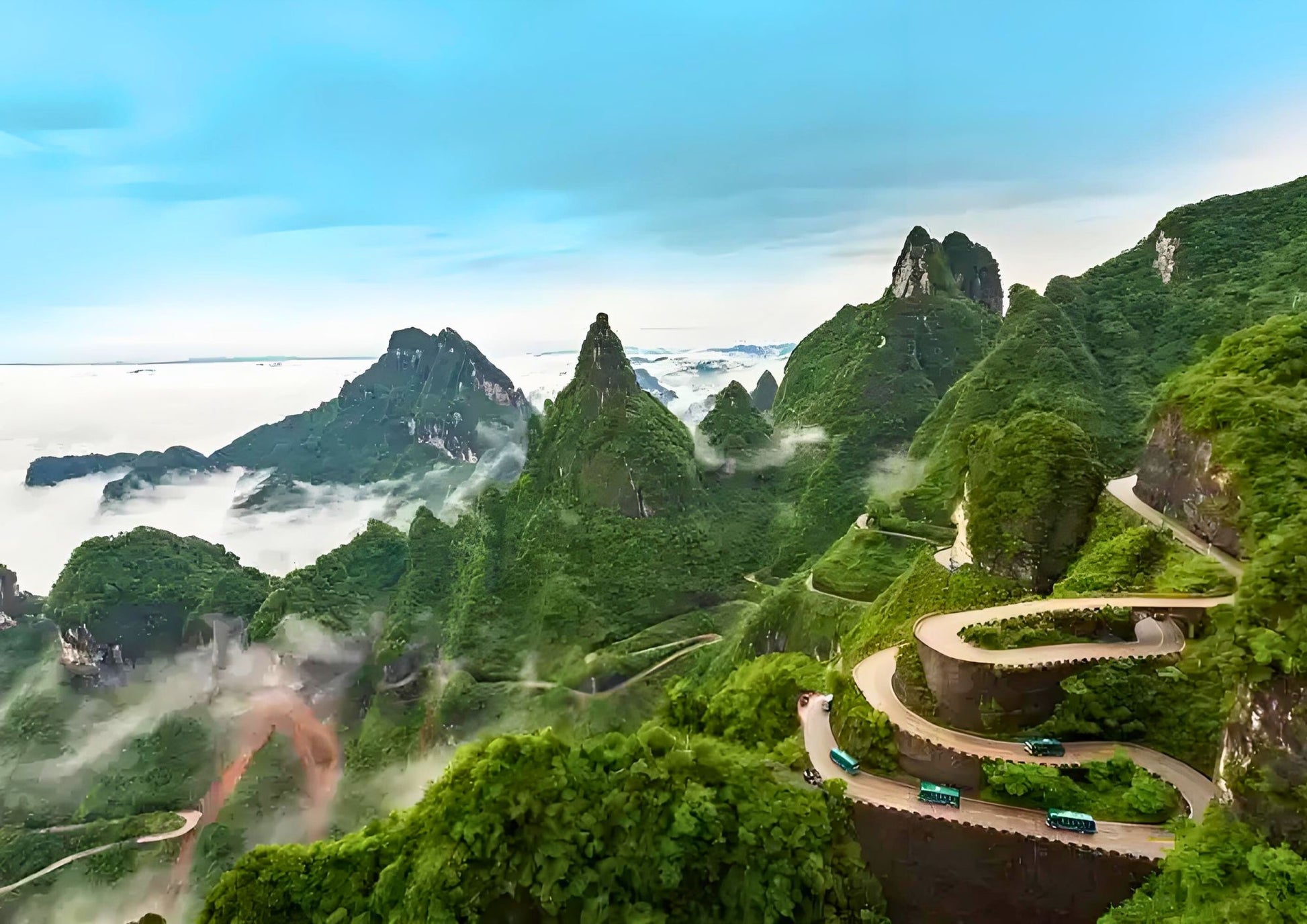 天門山国家森林公園は、スリリングな「天門洞」で有名で、世界最長のロープウェイや崖に張り付いたガラスの歩道があります。霧に包まれた山々は、冒険と自然の絶景を楽しむ最高の場所です。