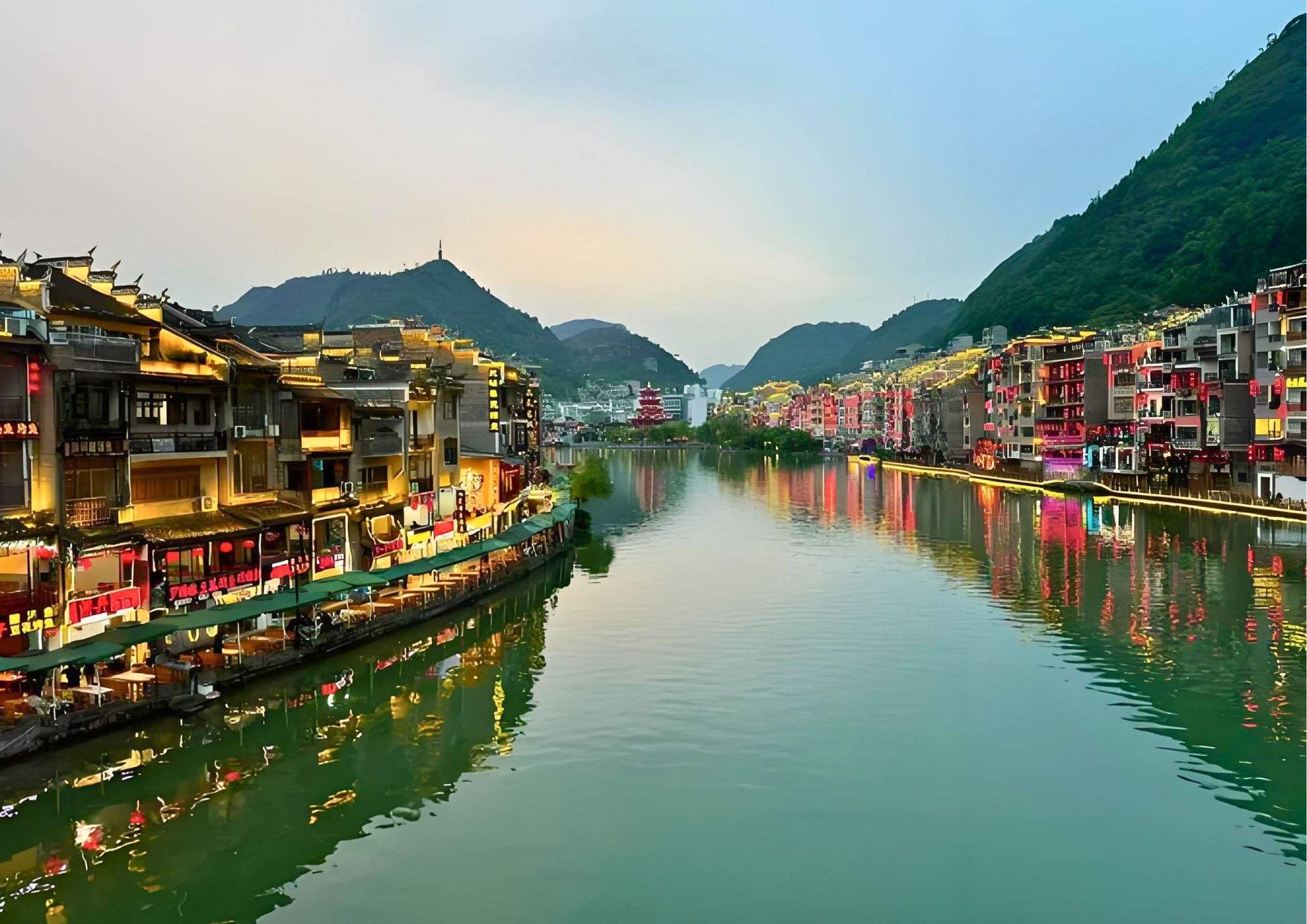 Zhenyuan Ancient Town, a historic treasure in Guizhou, is cradled by the winding Wuyang River. Its Ming-Qing architecture and cobblestone streets exude charm, while night lights reflect on the water, blending Miao culture with scenic beauty.