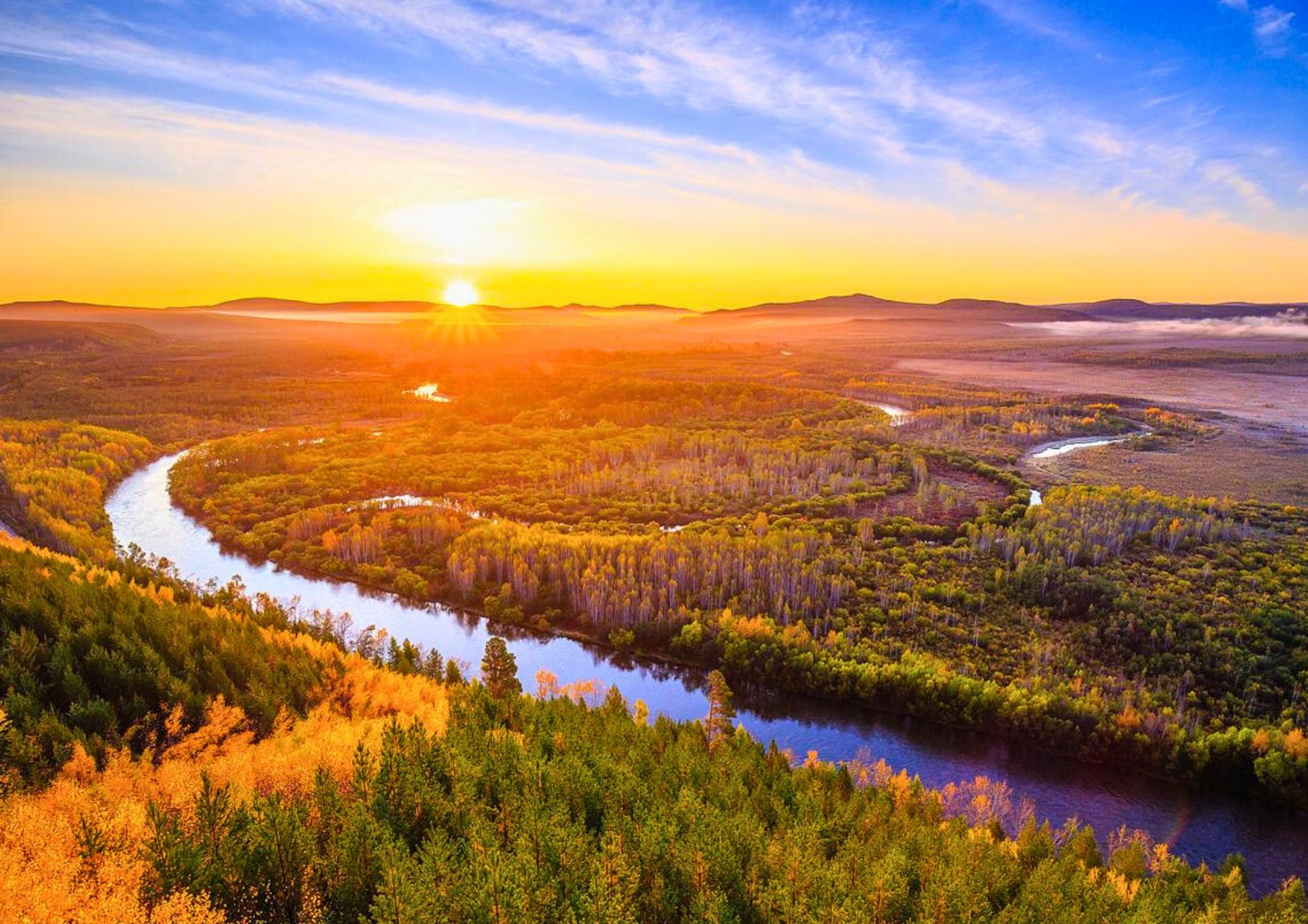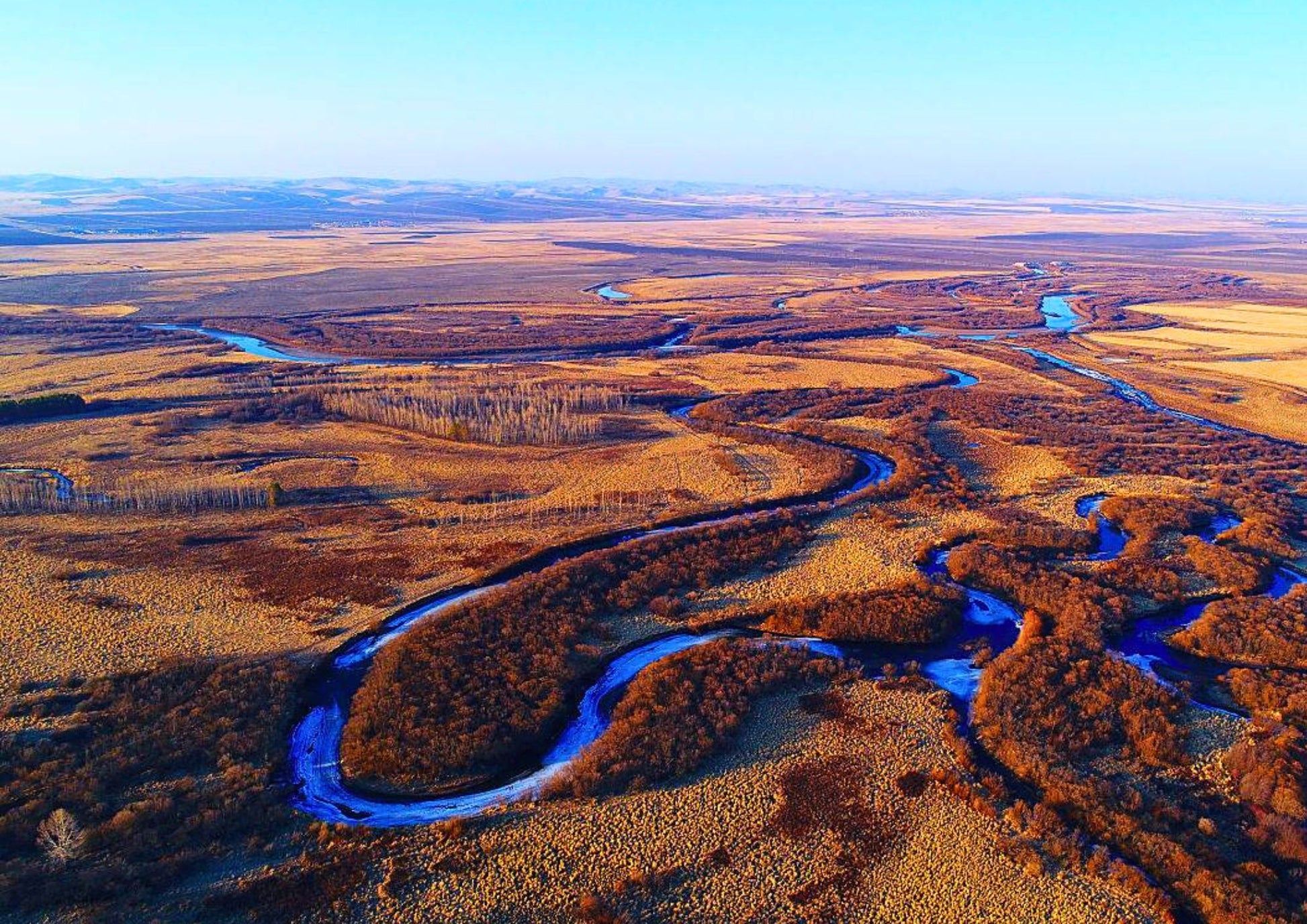The First Bend of the Heilongjiang River, located in Mohe City, Heilongjiang Province, is a magnificent meander of the river. In autumn and winter, golden hues and snow create a breathtaking landscape, resembling a giant dragon, perfect for photography and nature lovers.