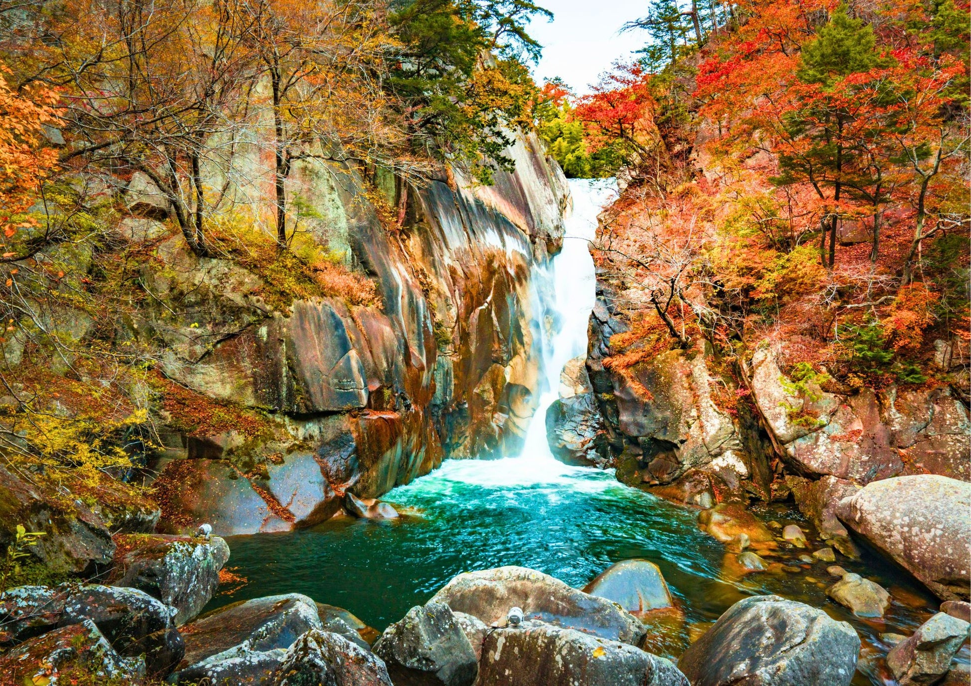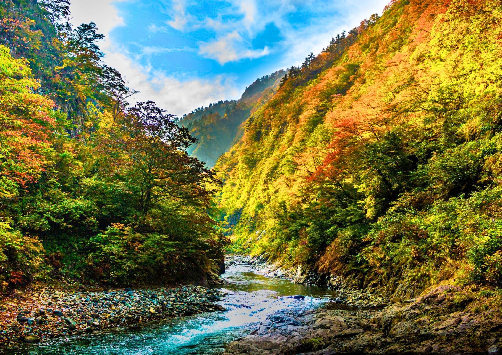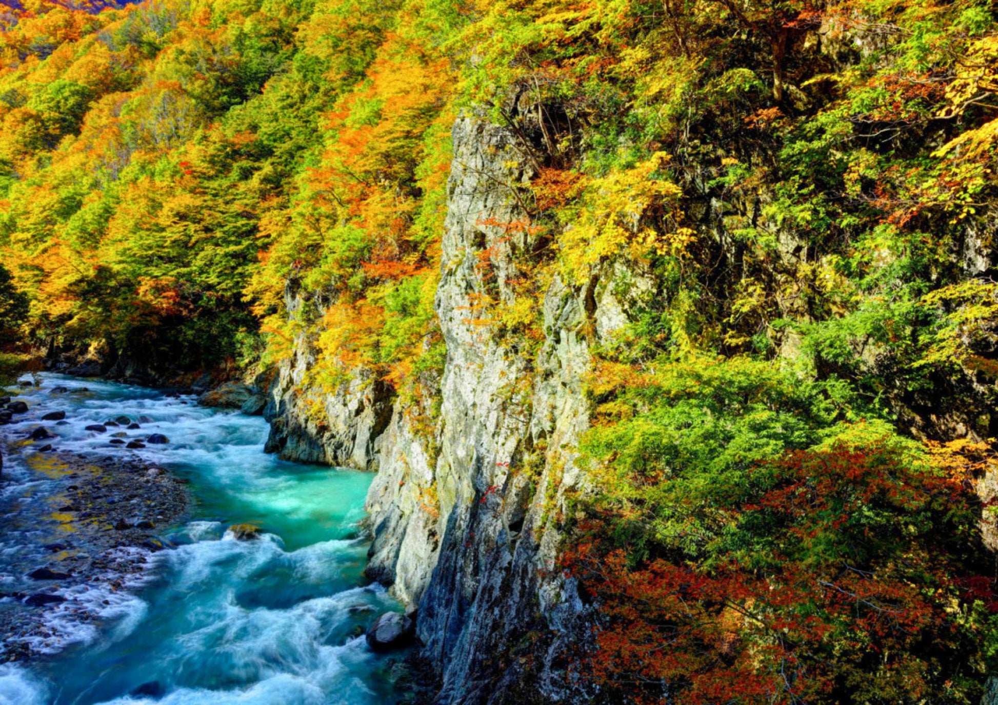 清津峽是日本新潟縣的壯麗峽谷,以清澈的溪流和陡峭的岩壁聞名。秋季紅葉如畫,夏季綠意盎然,是徒步與攝影的絕佳地點。峽谷中的隧道與吊橋更添探險樂趣。