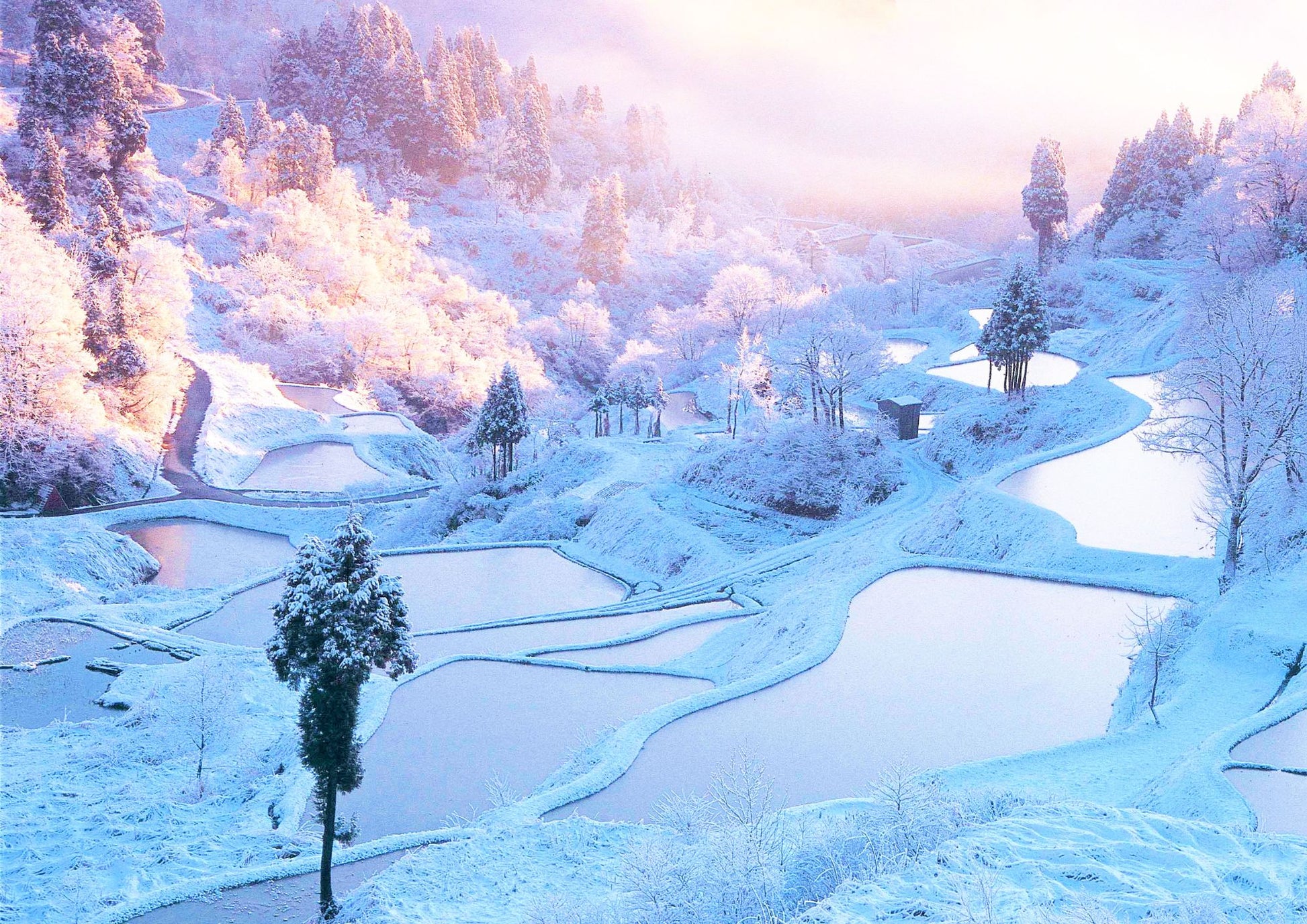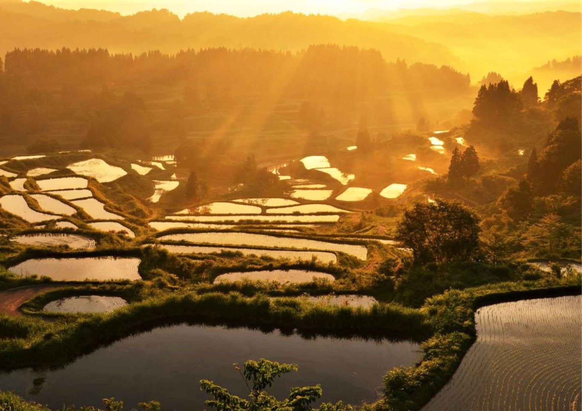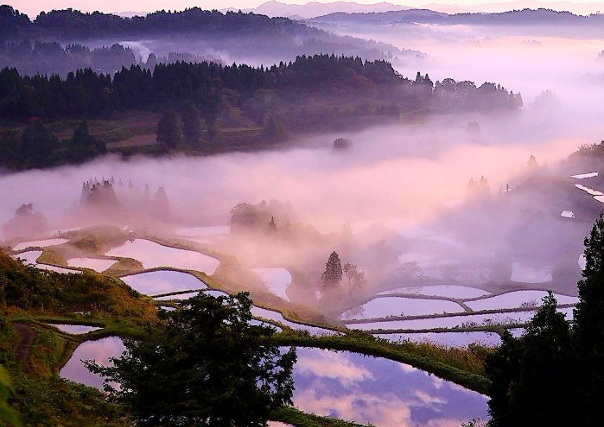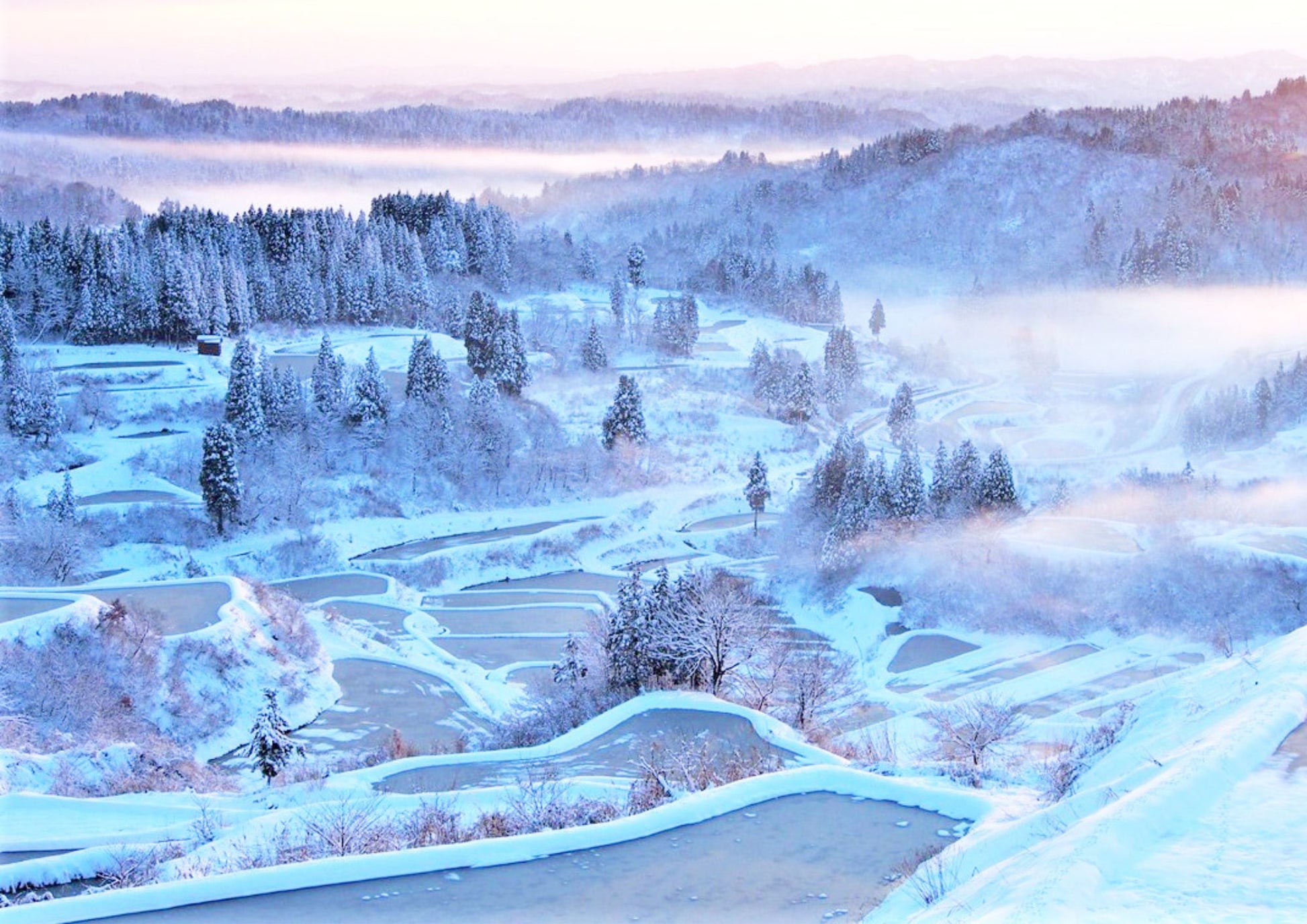 星峠棚田是新潟縣十日町市的絕景梯田,被譽為「日本最美農田」。晨霧繚繞時,水鏡般的田面倒映天空與山影,四季變換如詩如畫,是攝影師與自然愛好者的聖地。