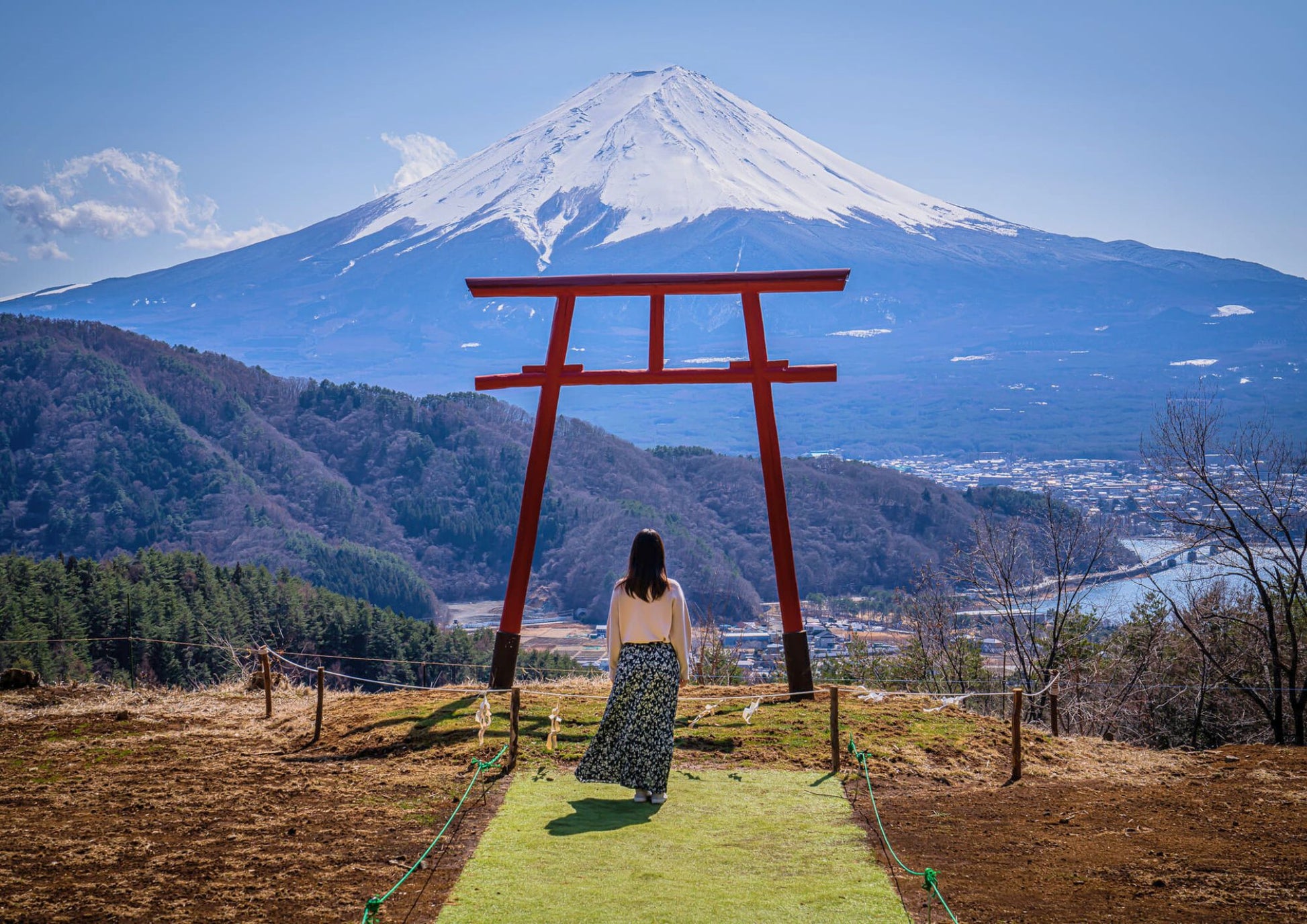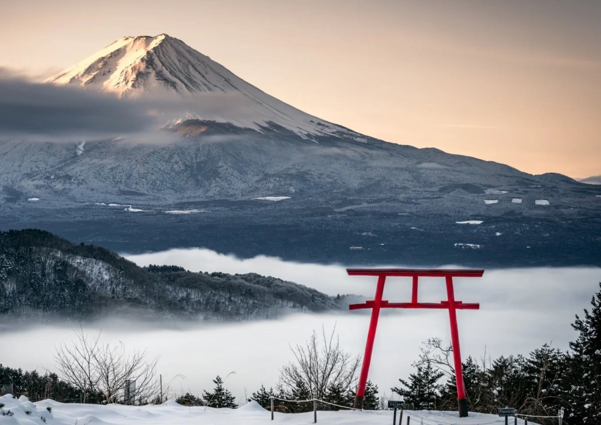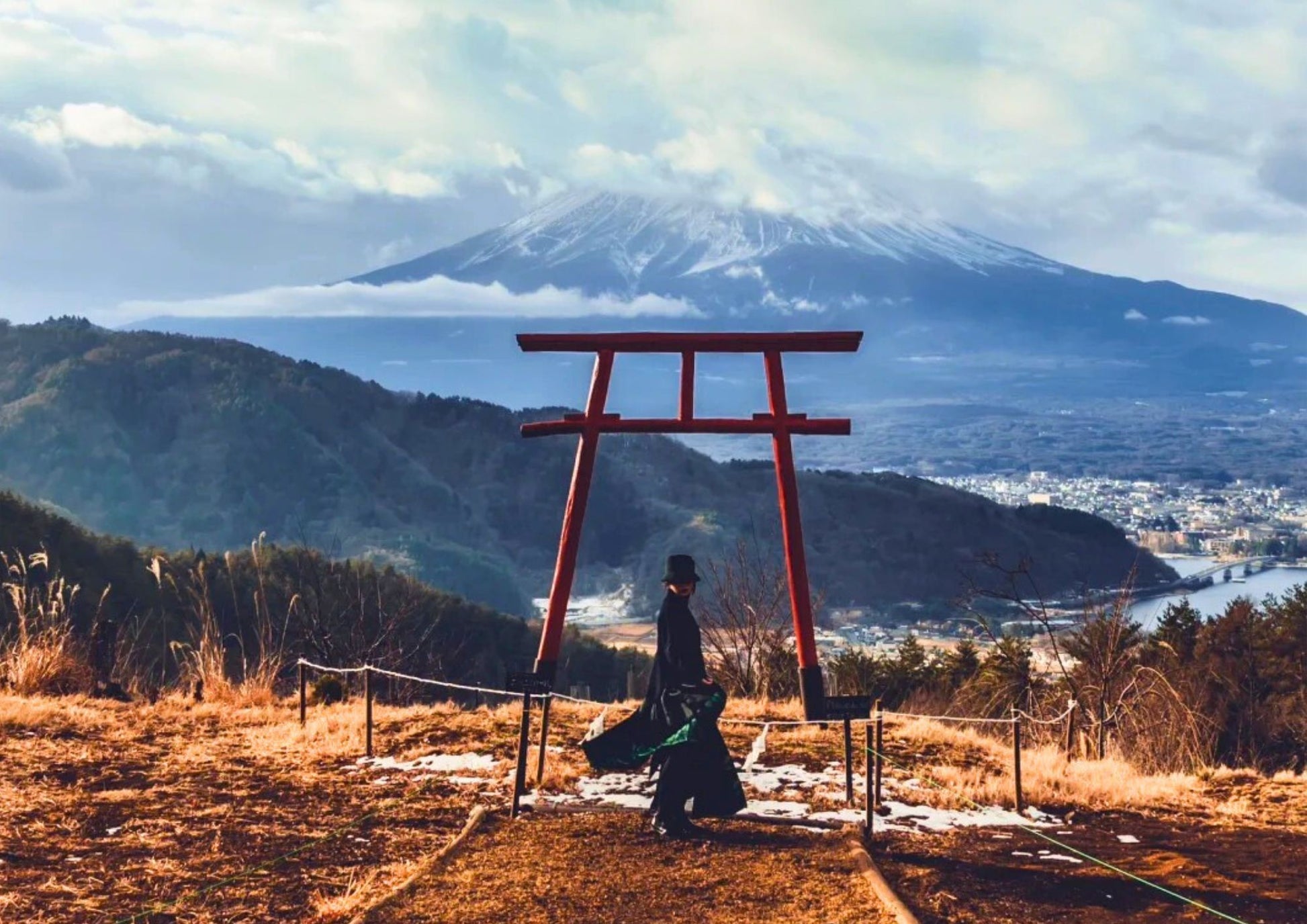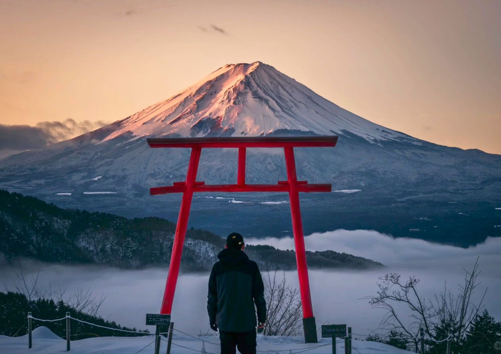河口浅間神社遥拝所的「天空鳥居」矗立於富士山腳,是絕佳的觀景點。透過鳥居遠眺富士山,彷彿與神明對話,雲海與山景交織,宛如仙境,充滿靈性與震撼。