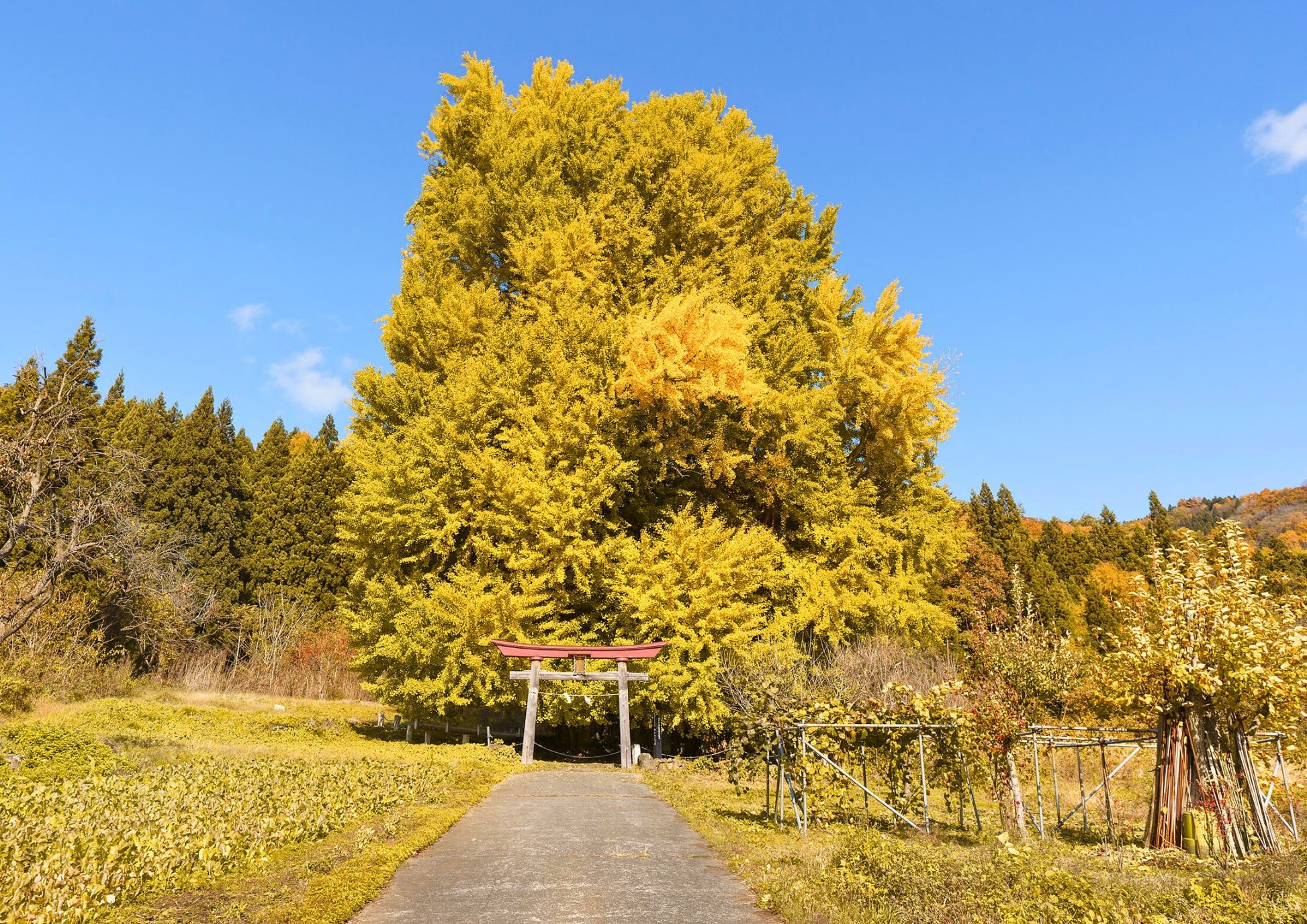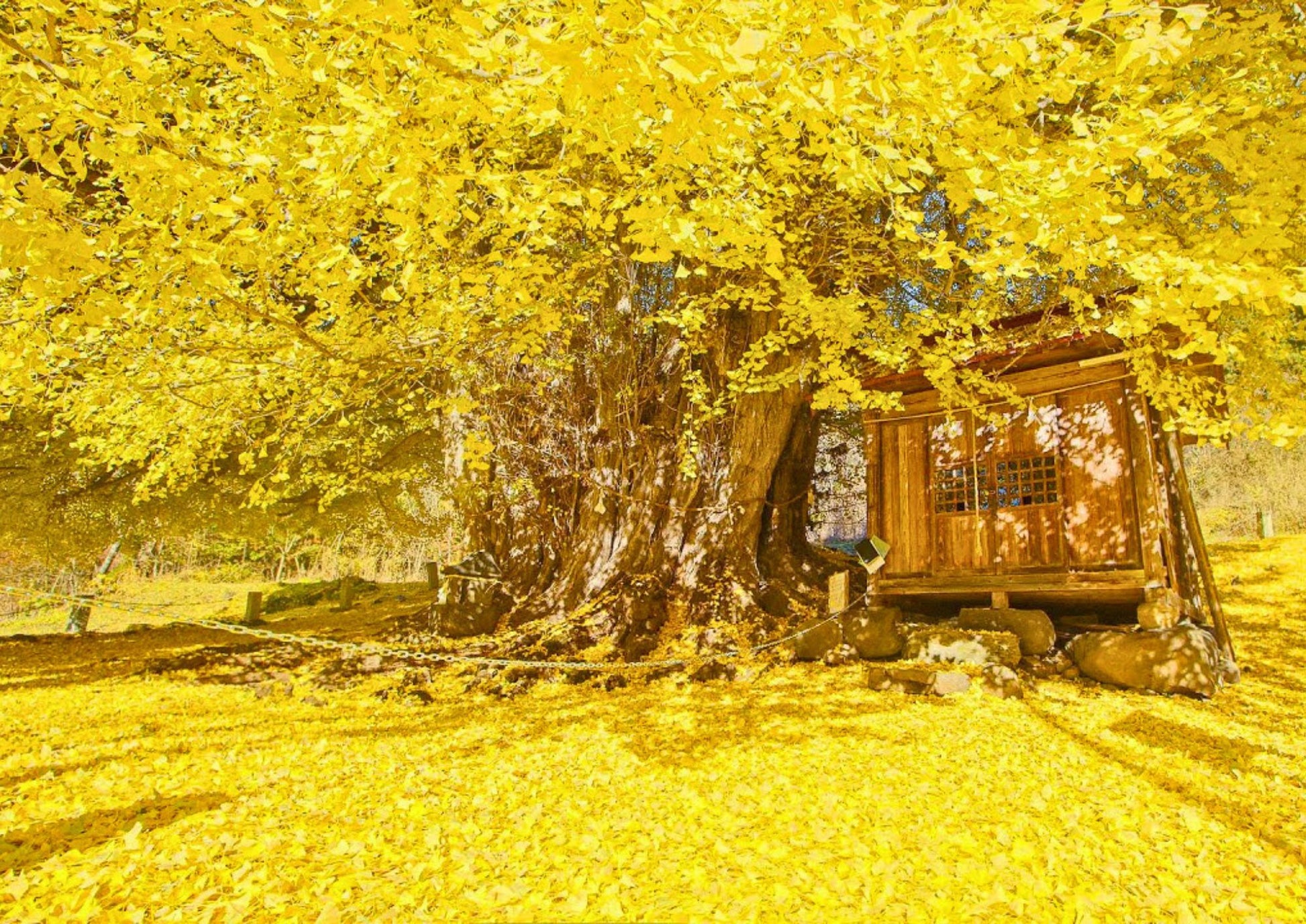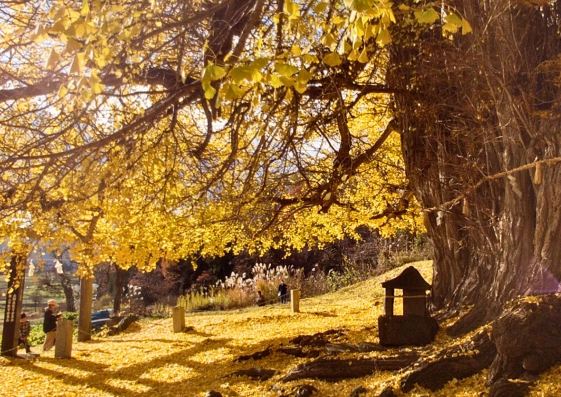 飯山市的「神戶大銀杏」高達36米,樹齡逾500年,是長野縣最大銀杏樹,被列為縣天然紀念物。其壯碩樹幹與金黃樹冠,如守護神般靜謐矗立,秋日更灑落滿地燦爛。