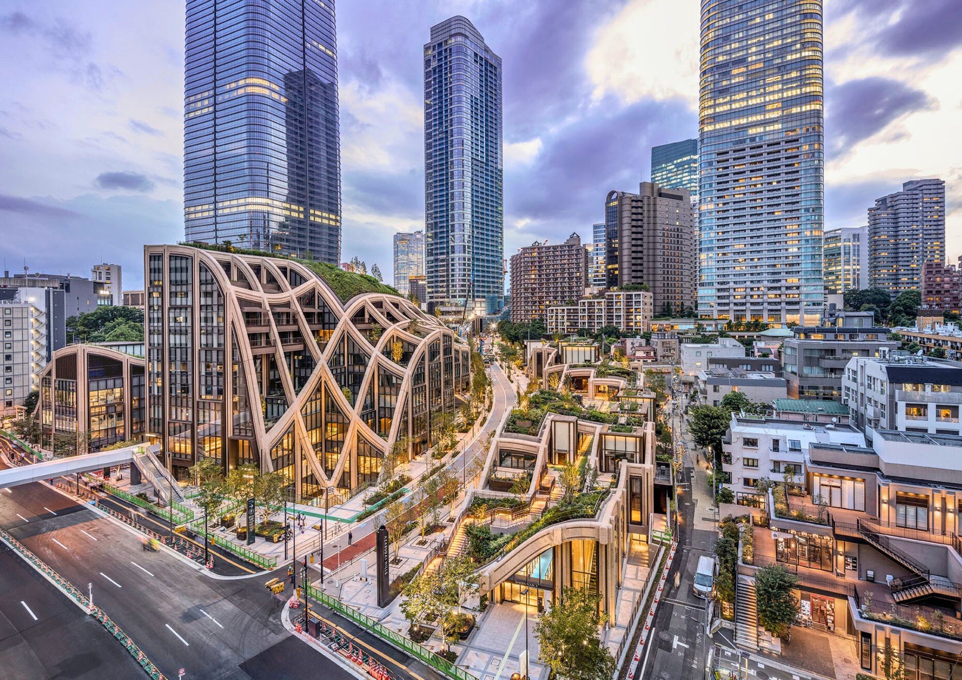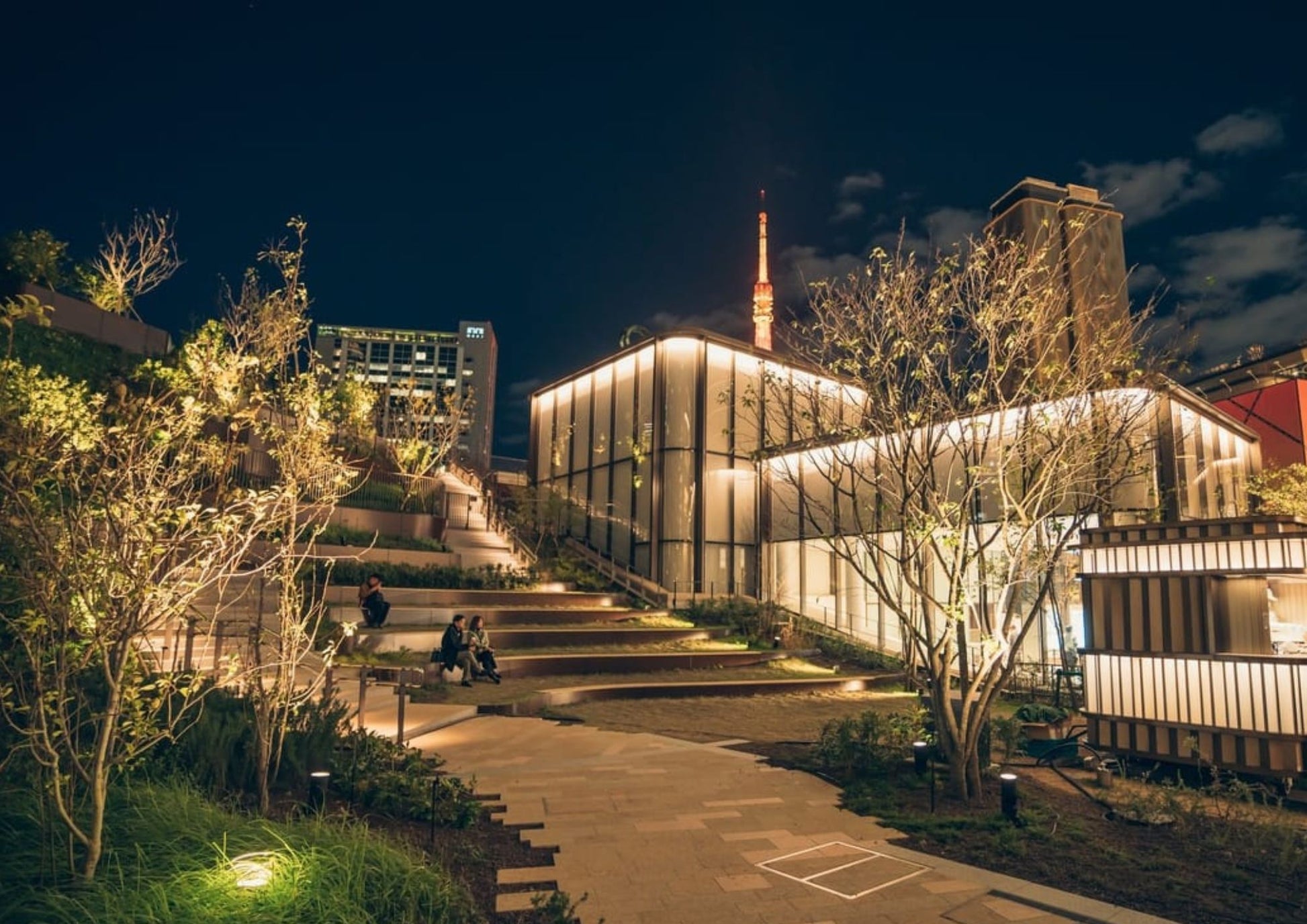 麻布台之丘是東京最新地標,融合現代建築與自然綠意,擁有高級住宅、商業設施與文化空間。頂層展望台可俯瞰東京鐵塔與城市全景,夜晚燈光璀璨,是時尚與奢華的代名詞。