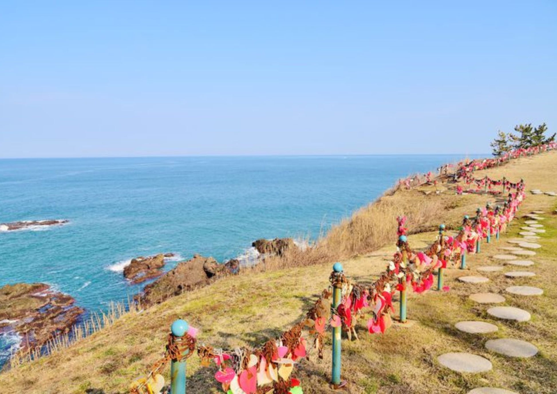 柏崎戀人岬是日本新潟縣的浪漫地標,以心形雕塑和愛情鎖聞名。站在懸崖眺望日本海壯麗夕陽,傳說在此告白的情侶將獲得永恆幸福,被譽為「戀人的聖地」。